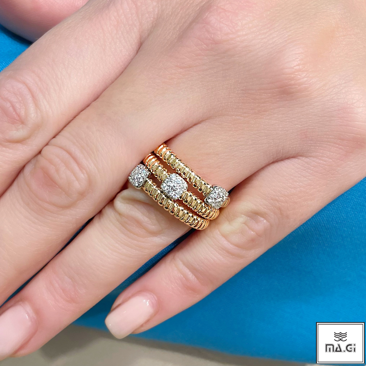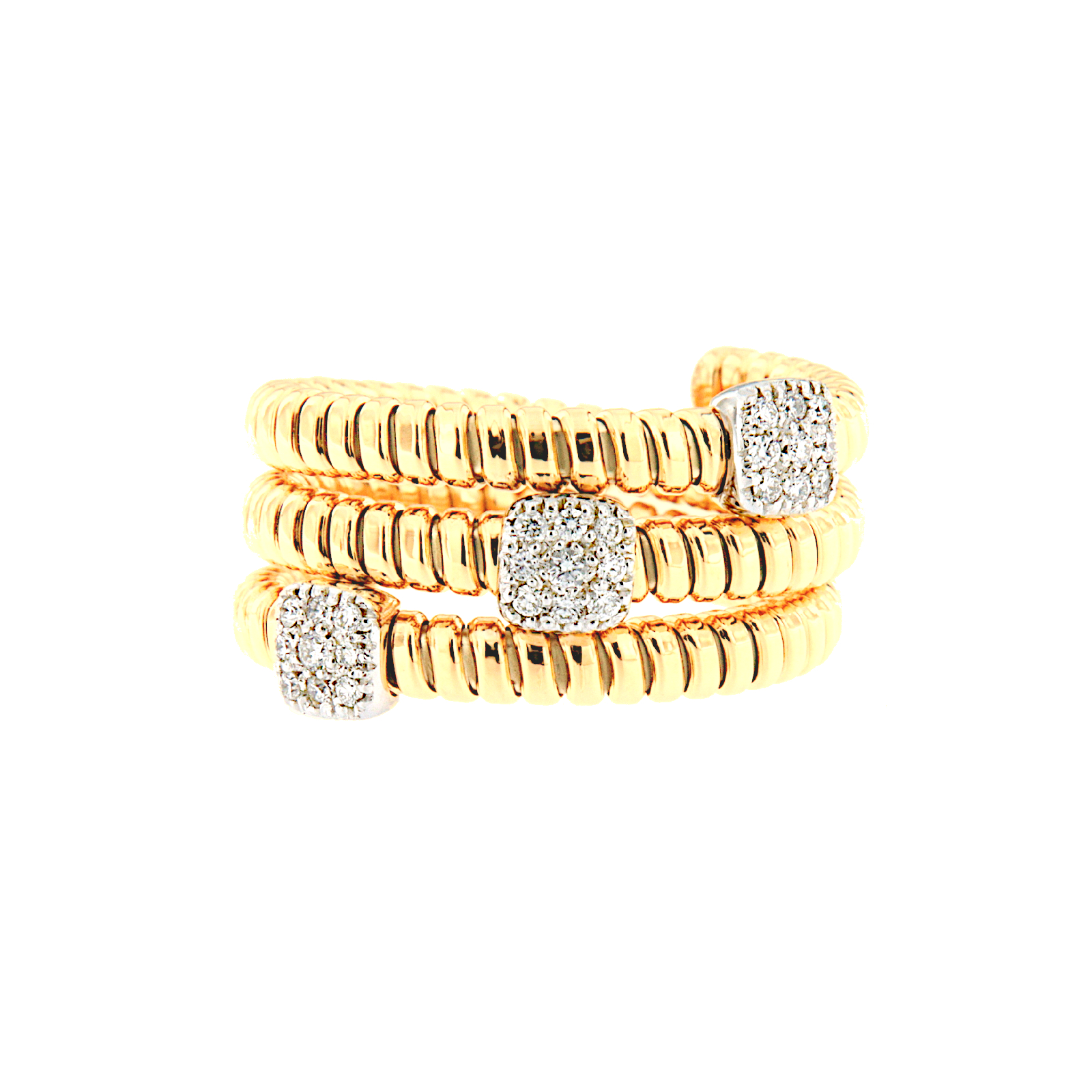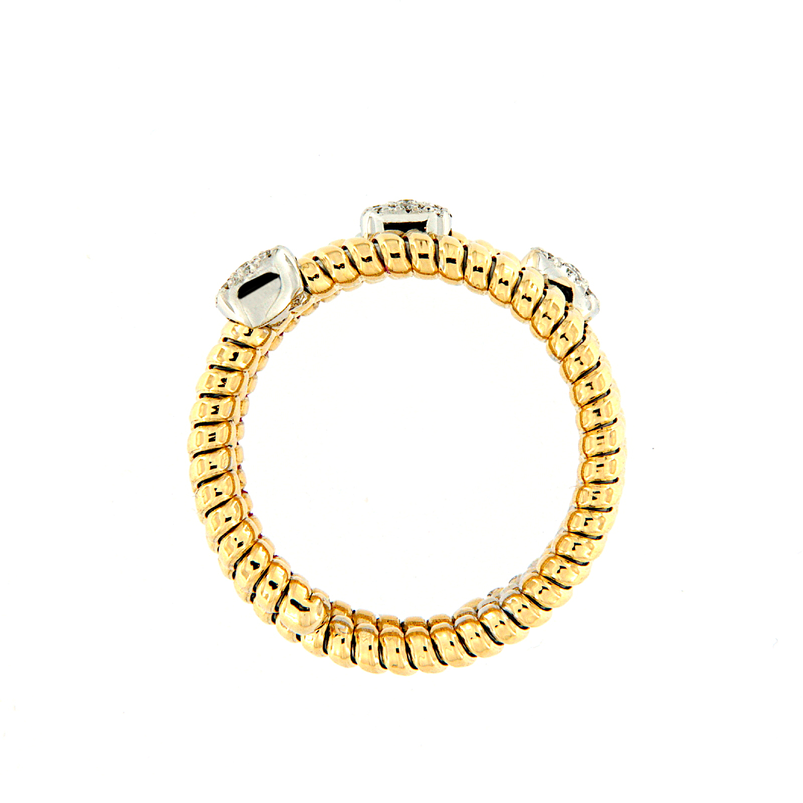 Anello a spirale maglia tubogas in oro giallo con incassati tre pavè di diamanti taglio brillante.