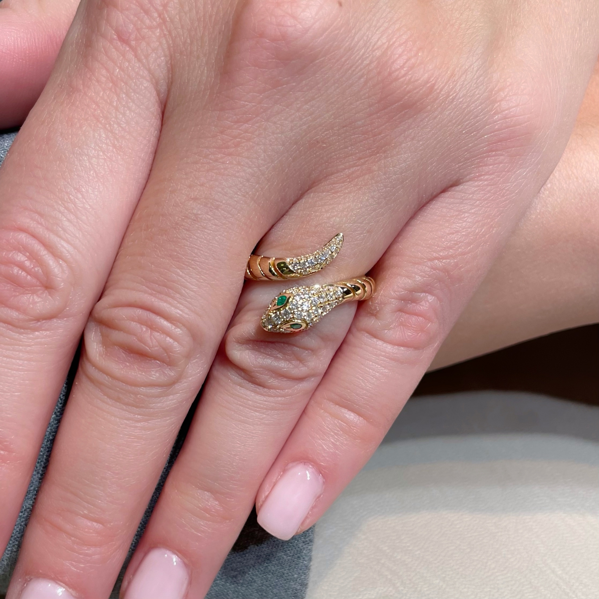 Anello serpente in oro giallo con incassati su testa e coda un pavè di diamanti taglio brillante ed occhi di smeraldo.