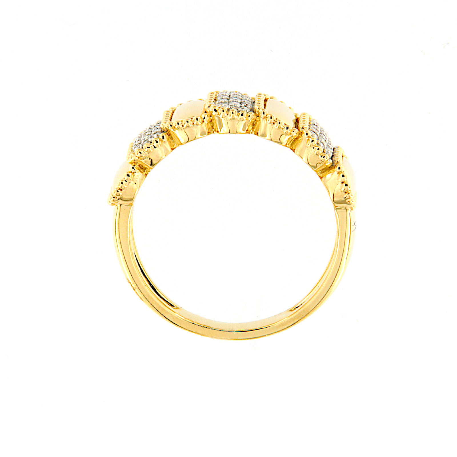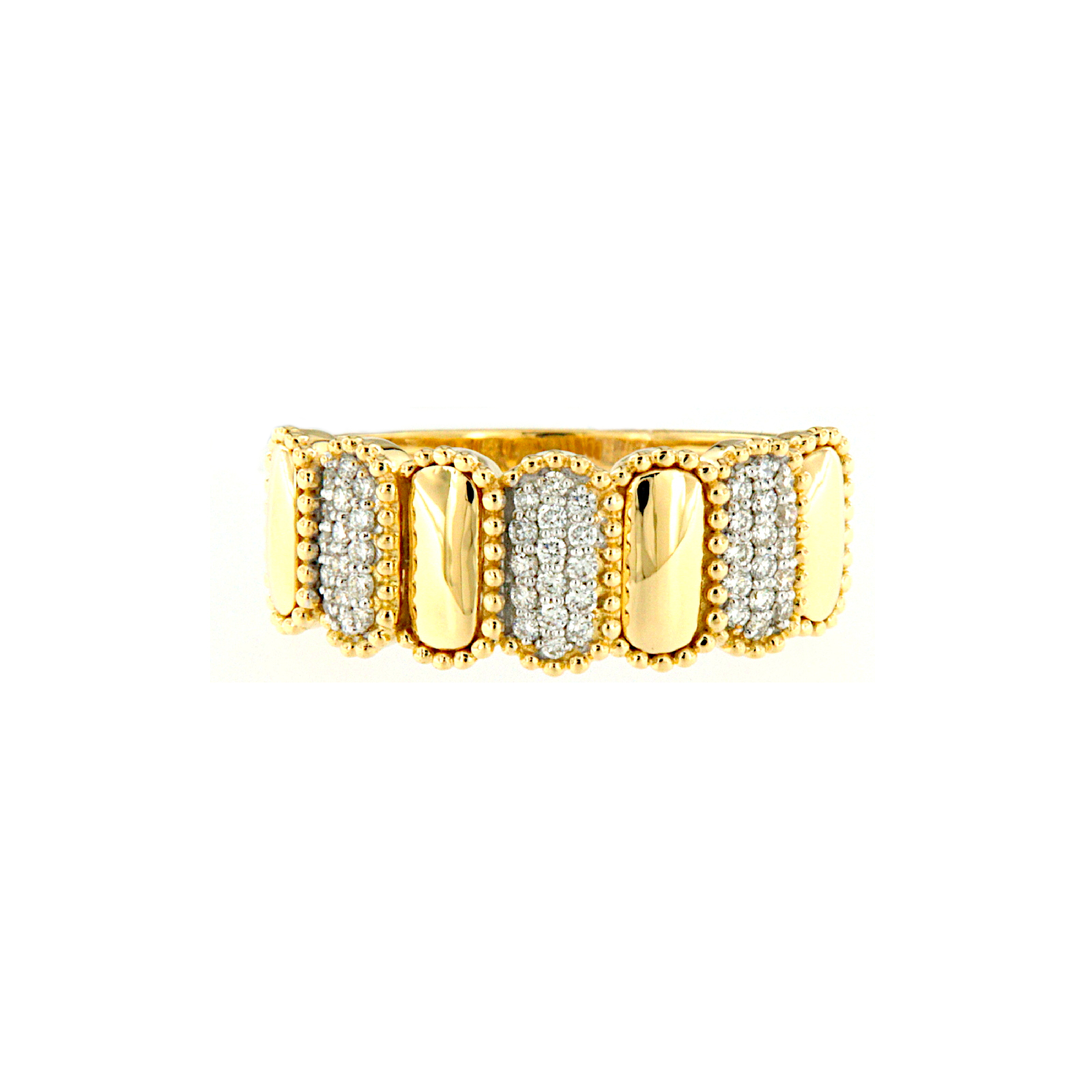 Anello in oro giallo con losanghe alternate, lucide e con pavè di diamanti taglio brillante, dal contorno con lavorazione perlè.
