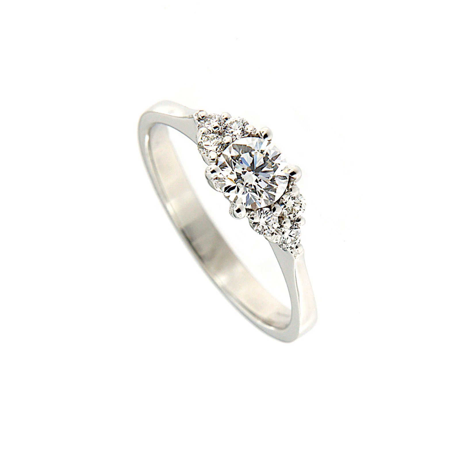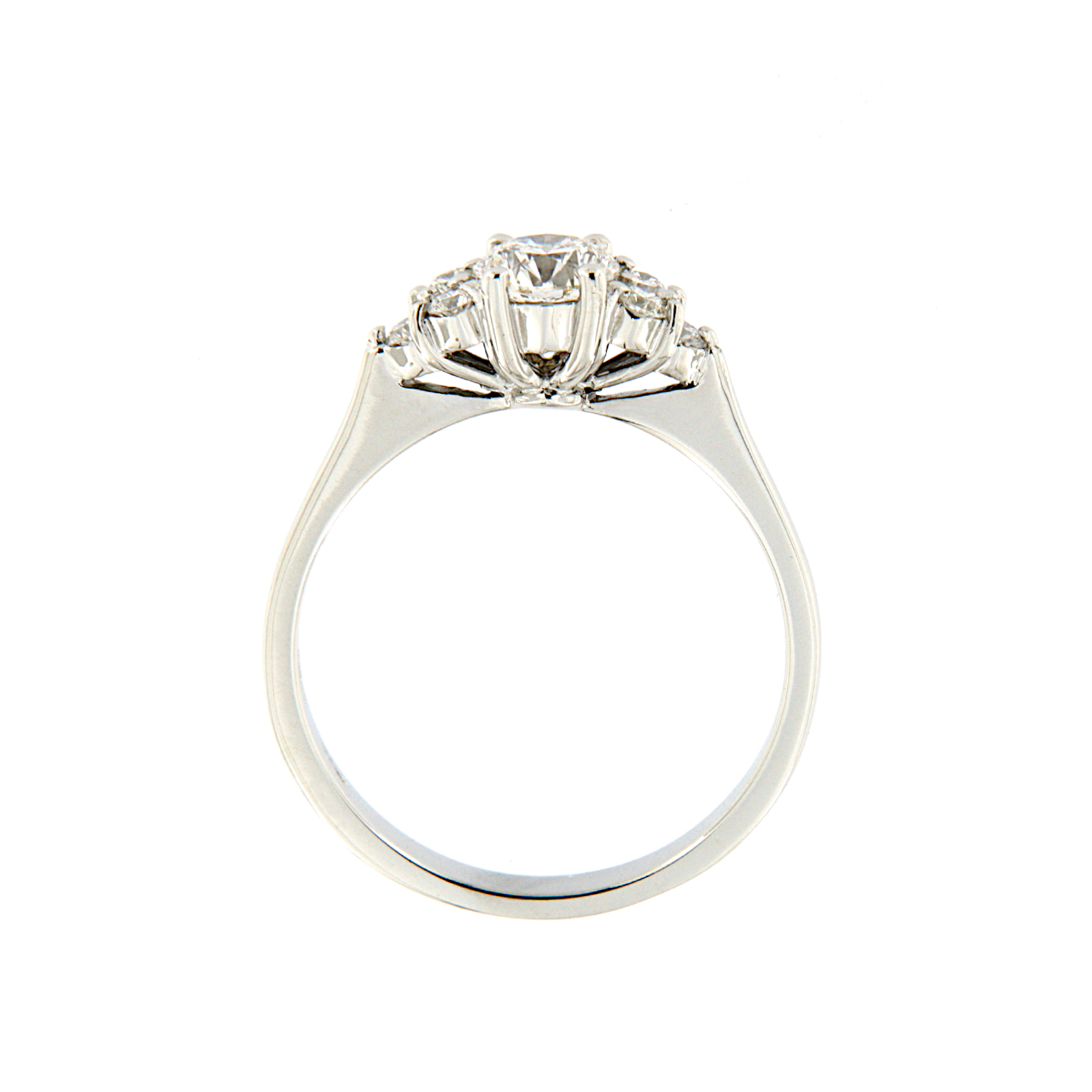 Anello in oro bianco con incassato su quattro griffes a filo un diamante taglio brillante centrale da cts 0,50 accompagnato da due triangoli laterali realizzati da sei diamanti.