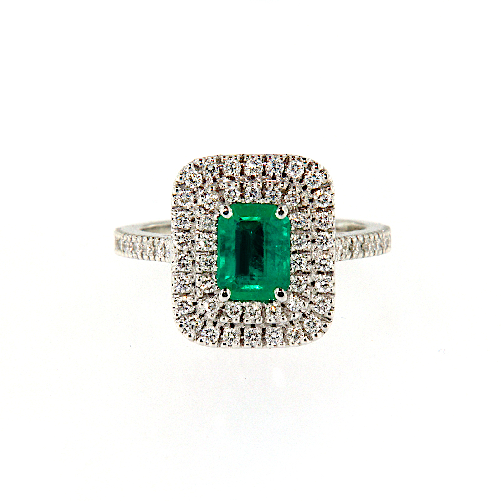 Anello in oro bianco con smeraldo a taglio smeraldo circondato da un doppio giro di diamanti taglio brillante che si estendono fino al gambo.