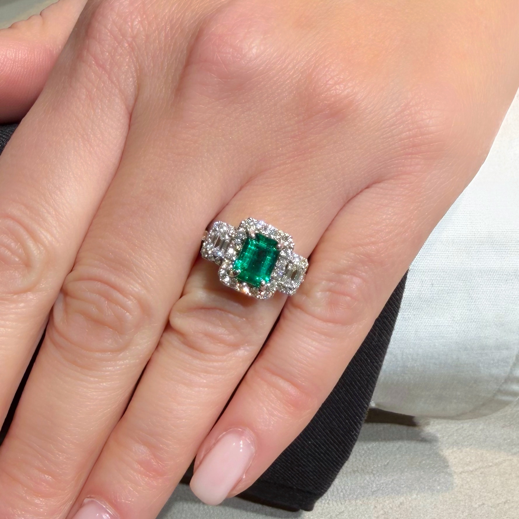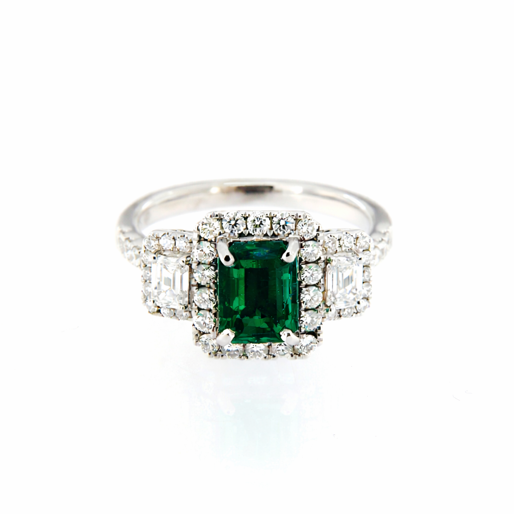 Anello in oro bianco con incassato uno smeraldo centrale impreziosito da un giro di diamanti taglio brillante e da due diamanti taglio smeraldo laterali anche essi contornati da diamanti taglio brillante che si estendono fino al gambo.