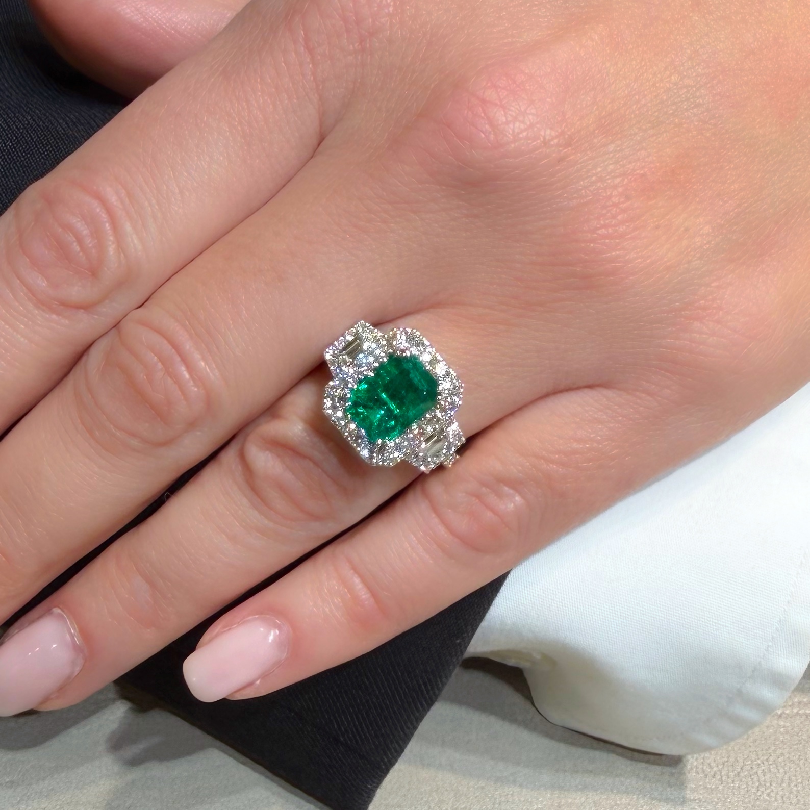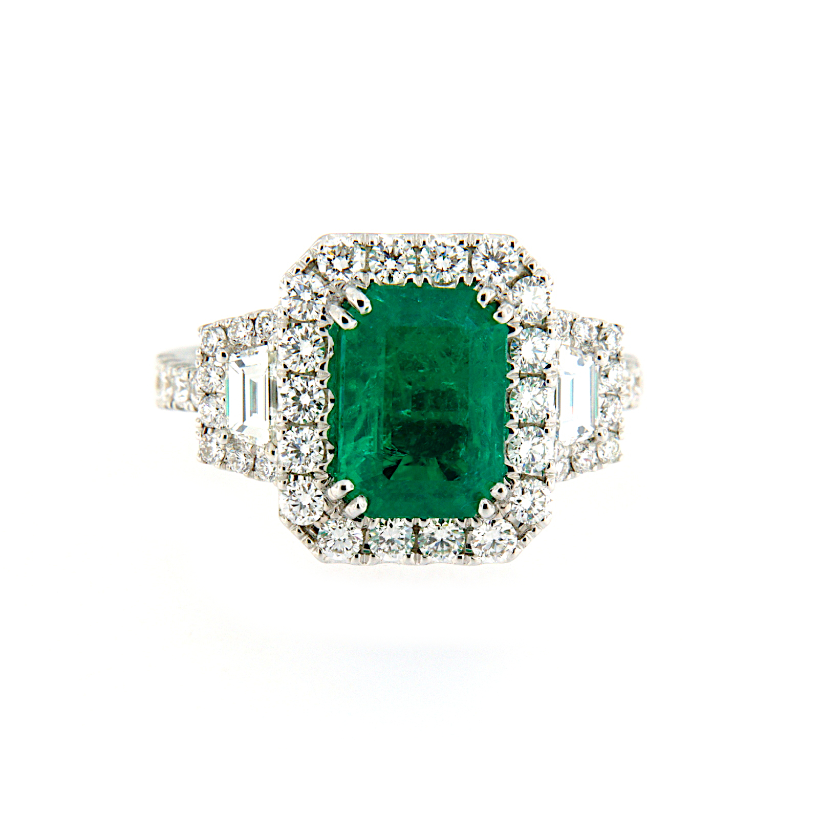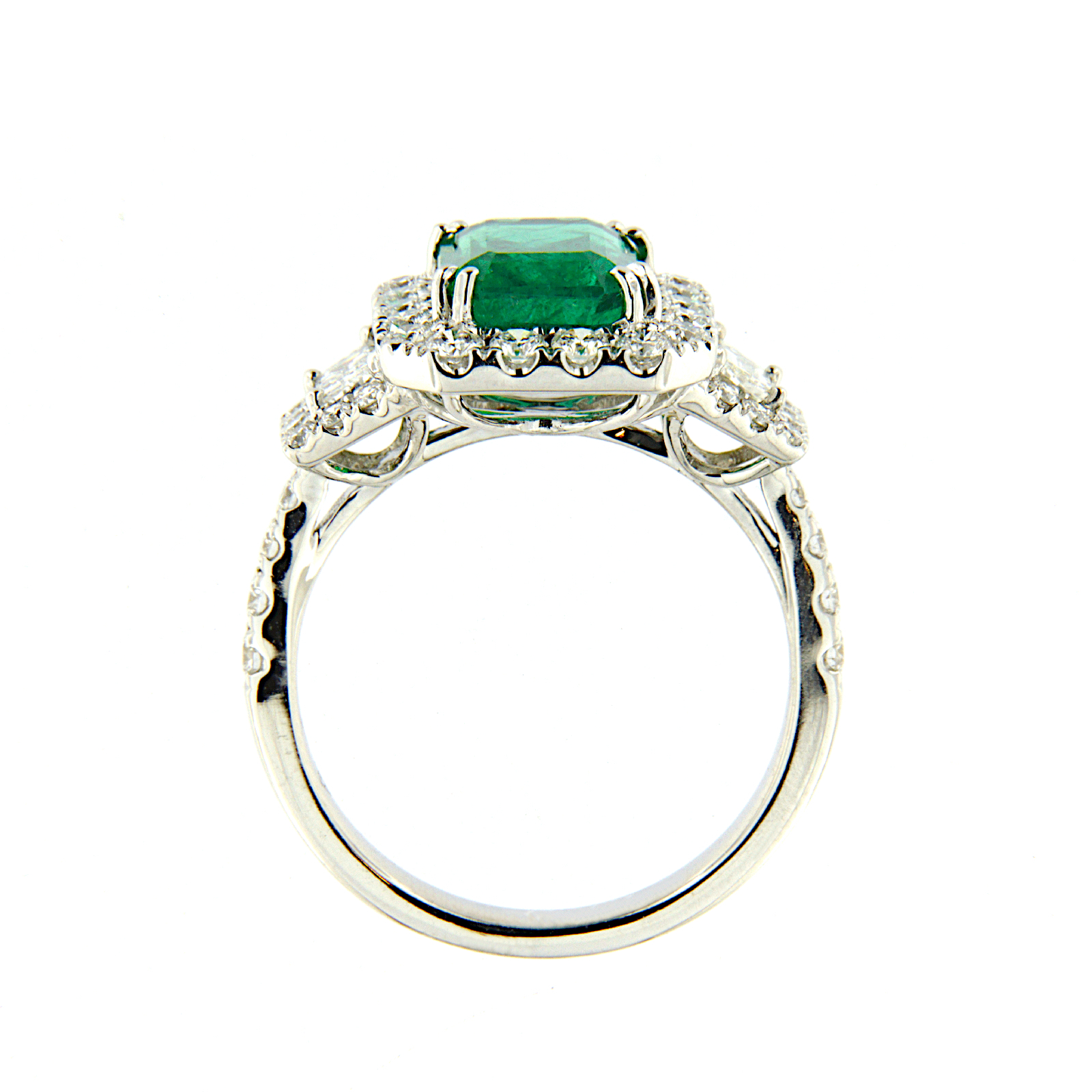 Anello in oro bianco con incassato uno smeraldo centrale circondato da una cornice di diamanti taglio brillante e preziosa coppia di diamanti taglio trapezio laterali anche essi circondati da diamanti taglio brillante che si estendono fino al gambo.