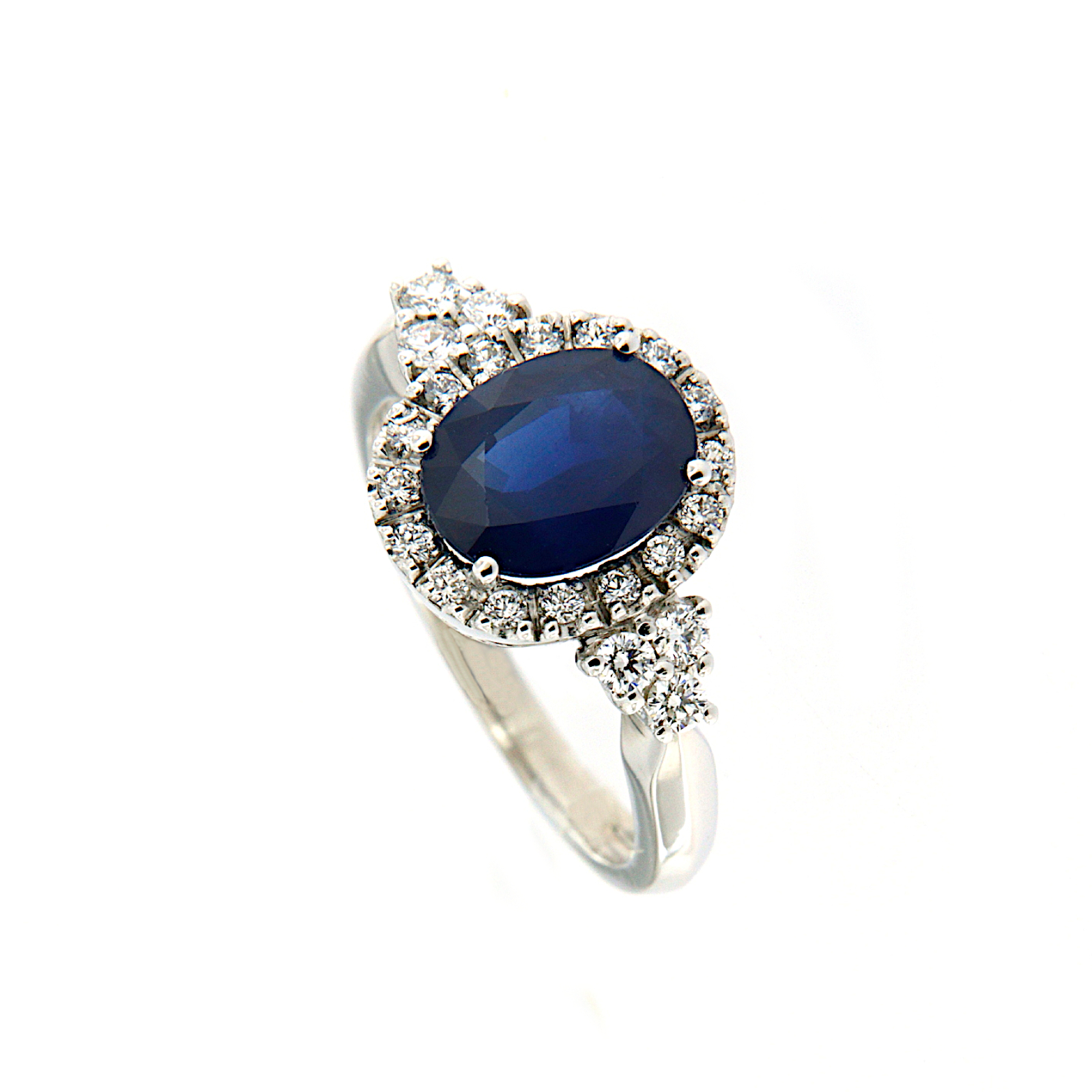 Anello in oro bianco con zaffiro ovale, circondato da diamanti taglio brillante e trilogy di diamanti laterali.