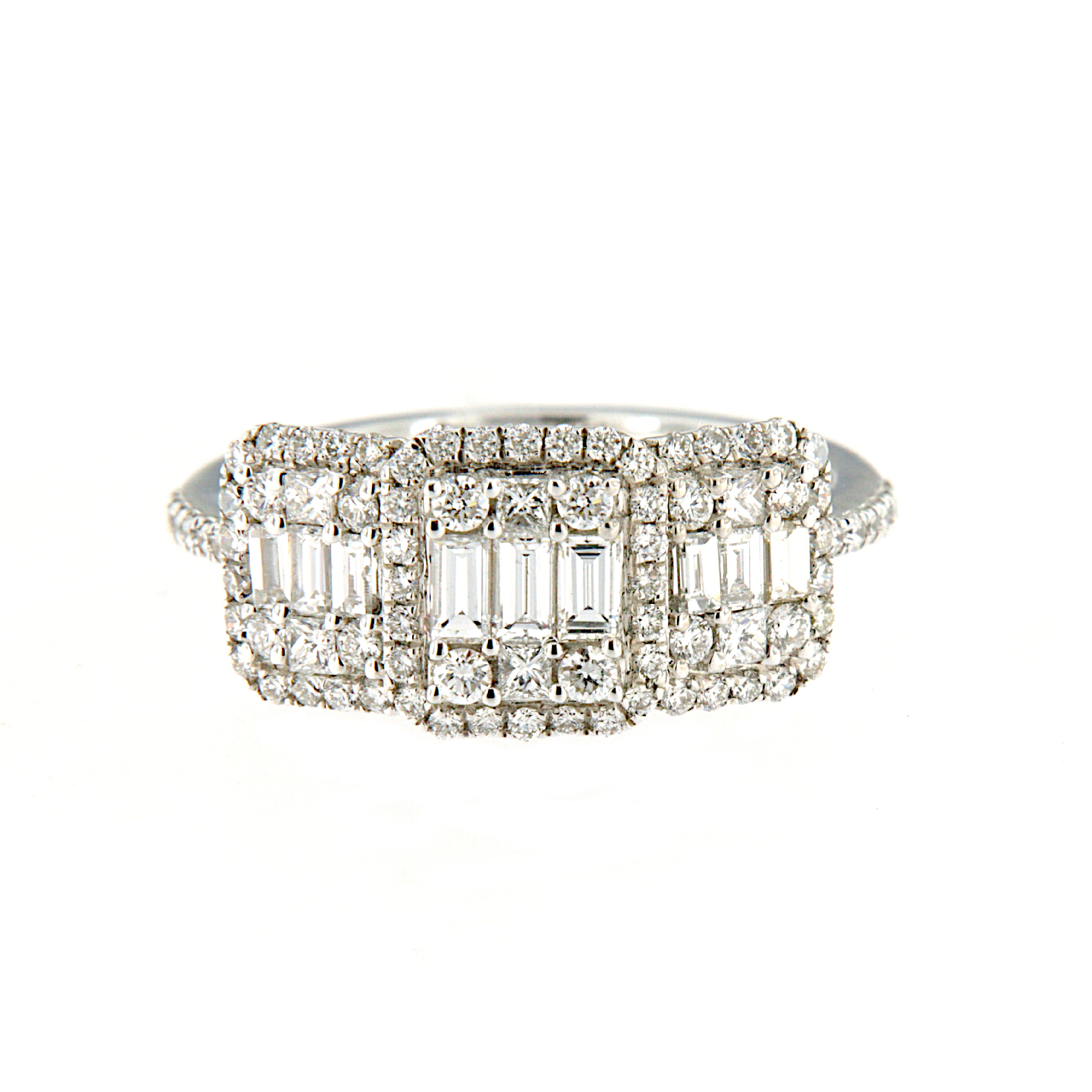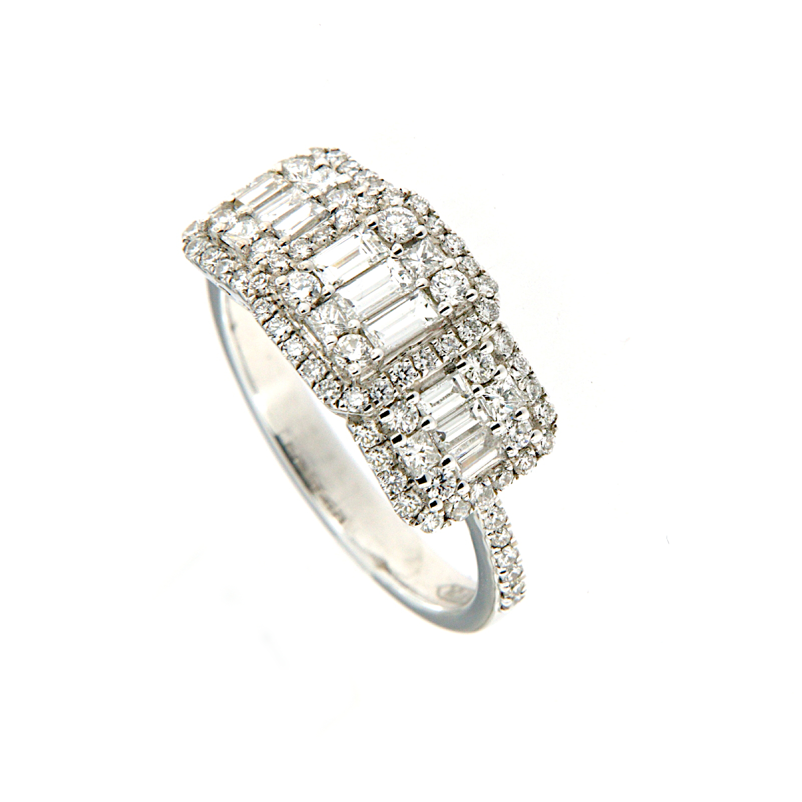 Anello in oro bianco a fascia dal motivo rettangolare con incassati una composizione di diamanti taglio baguettes incorniciati da un giro di diamanti taglio brillante che si estendono anche sul gambo.