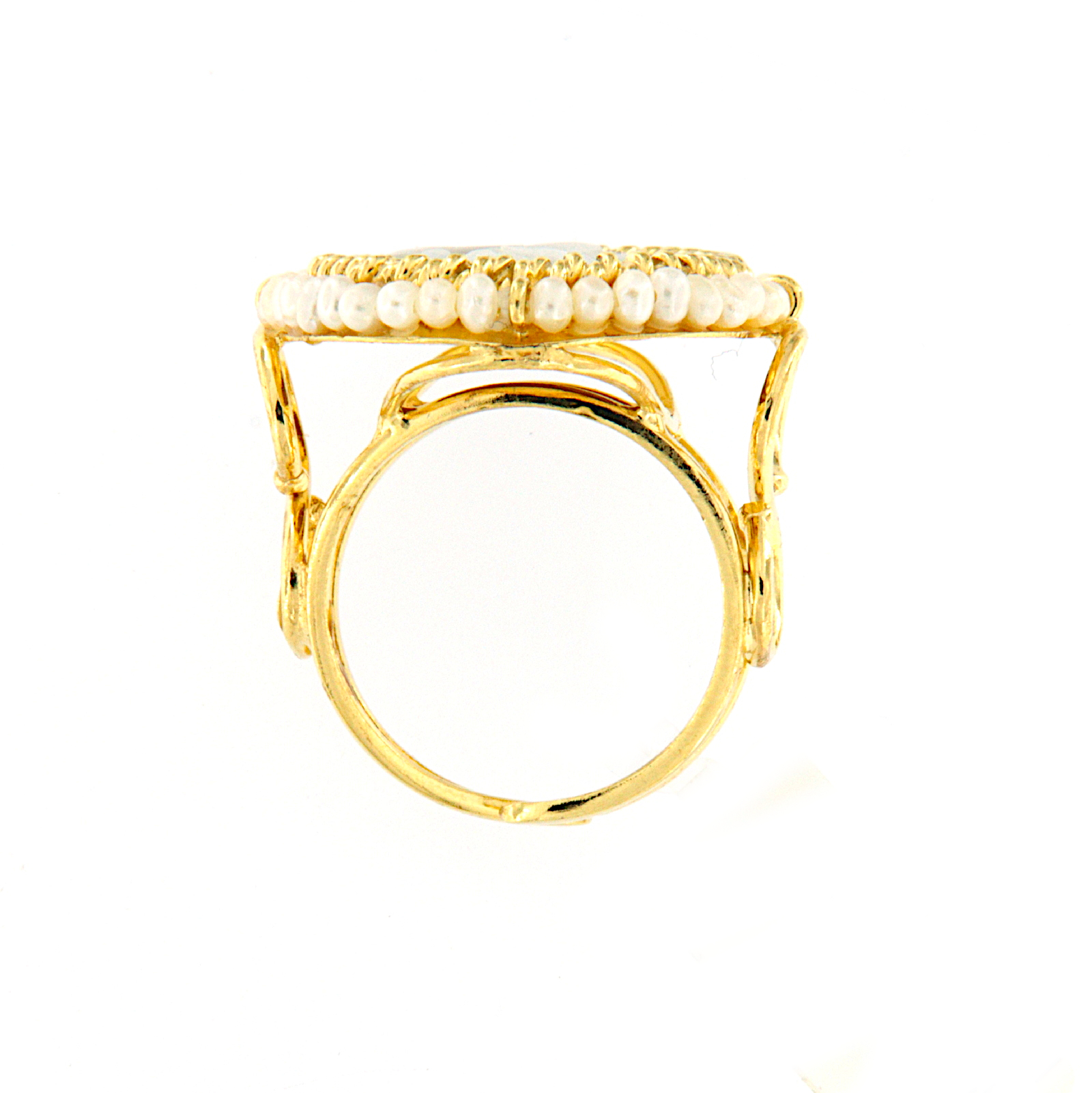 Anello in argento dorato con lavorazione a corda, cammeo centrale e giro esterno di perline. Gambo aperto per poter regolare la misura