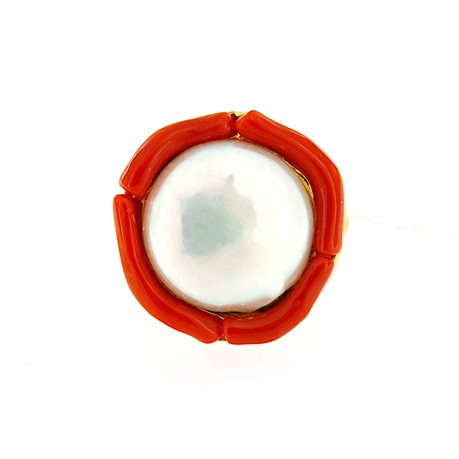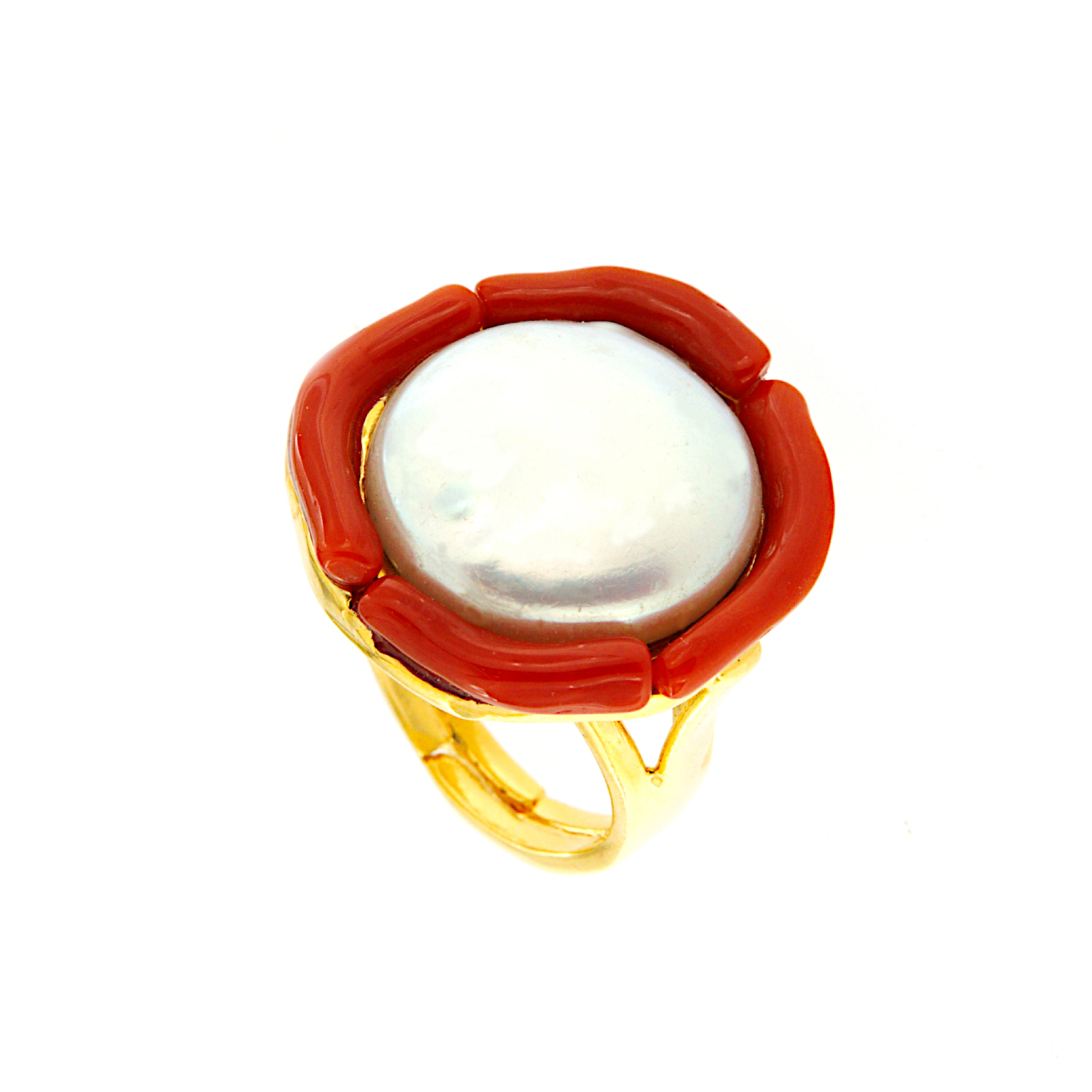 Anello in argento dorato con perla coltivata di acqua dolce piatta circondata da quattro rametti curvi di corallo rosso.