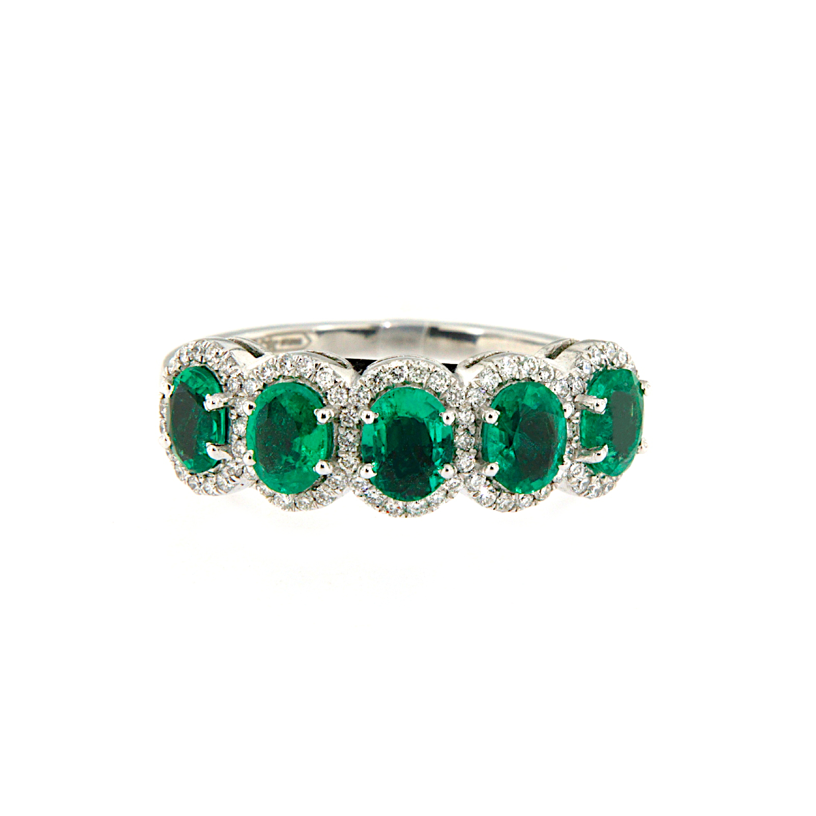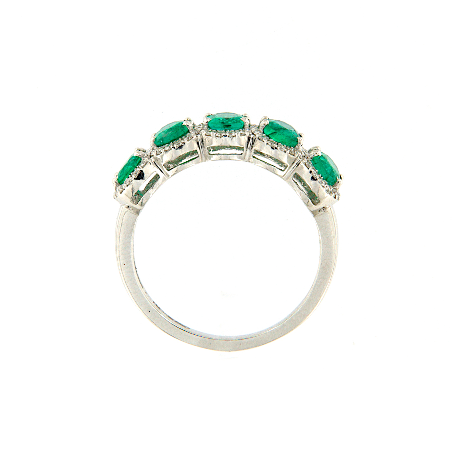 Anello in oro bianco con incassati smeraldi taglio ovale contornati da diamanti taglio brillante