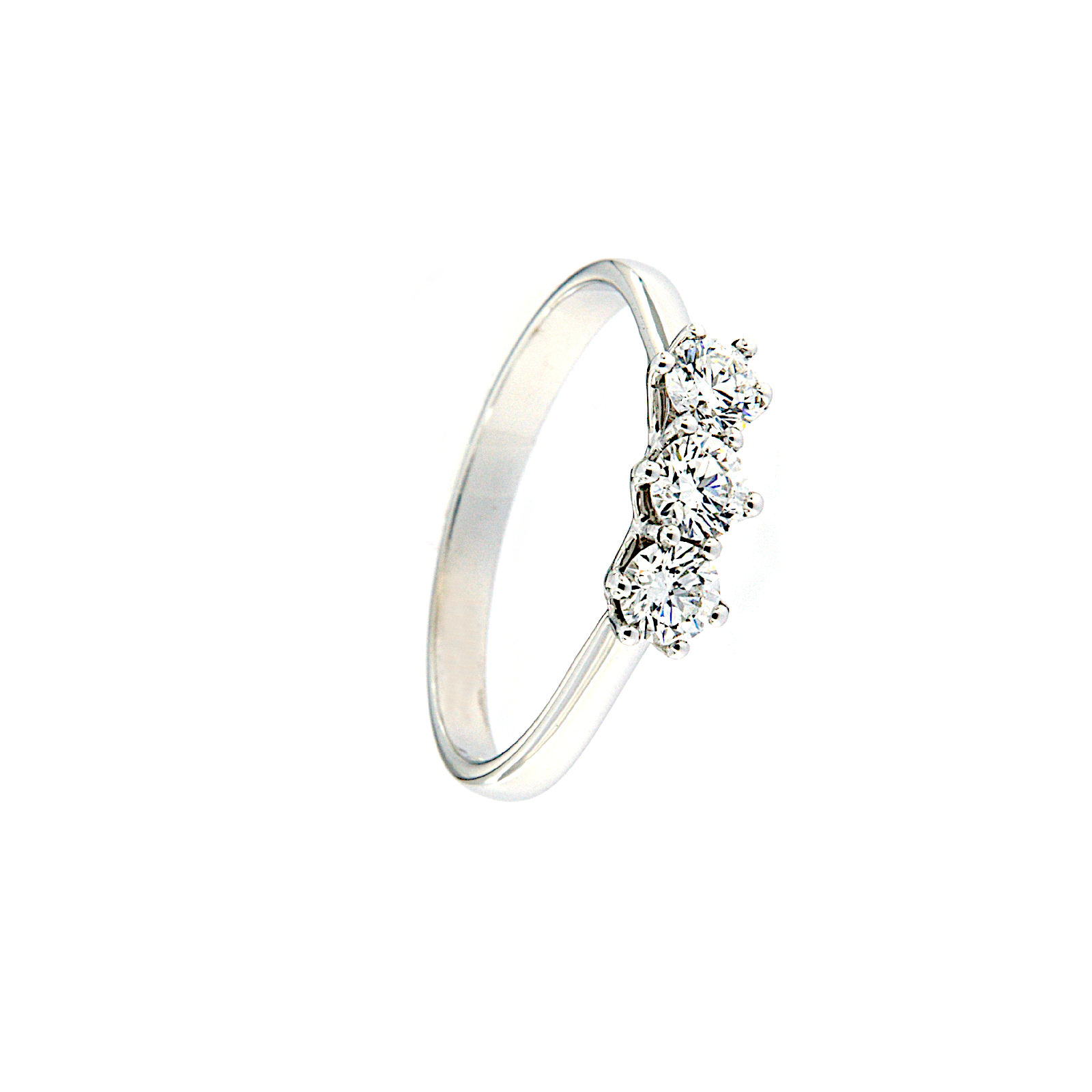 Anello in oro bianco con tre diamanti taglio brillante incassati su punte a filo.