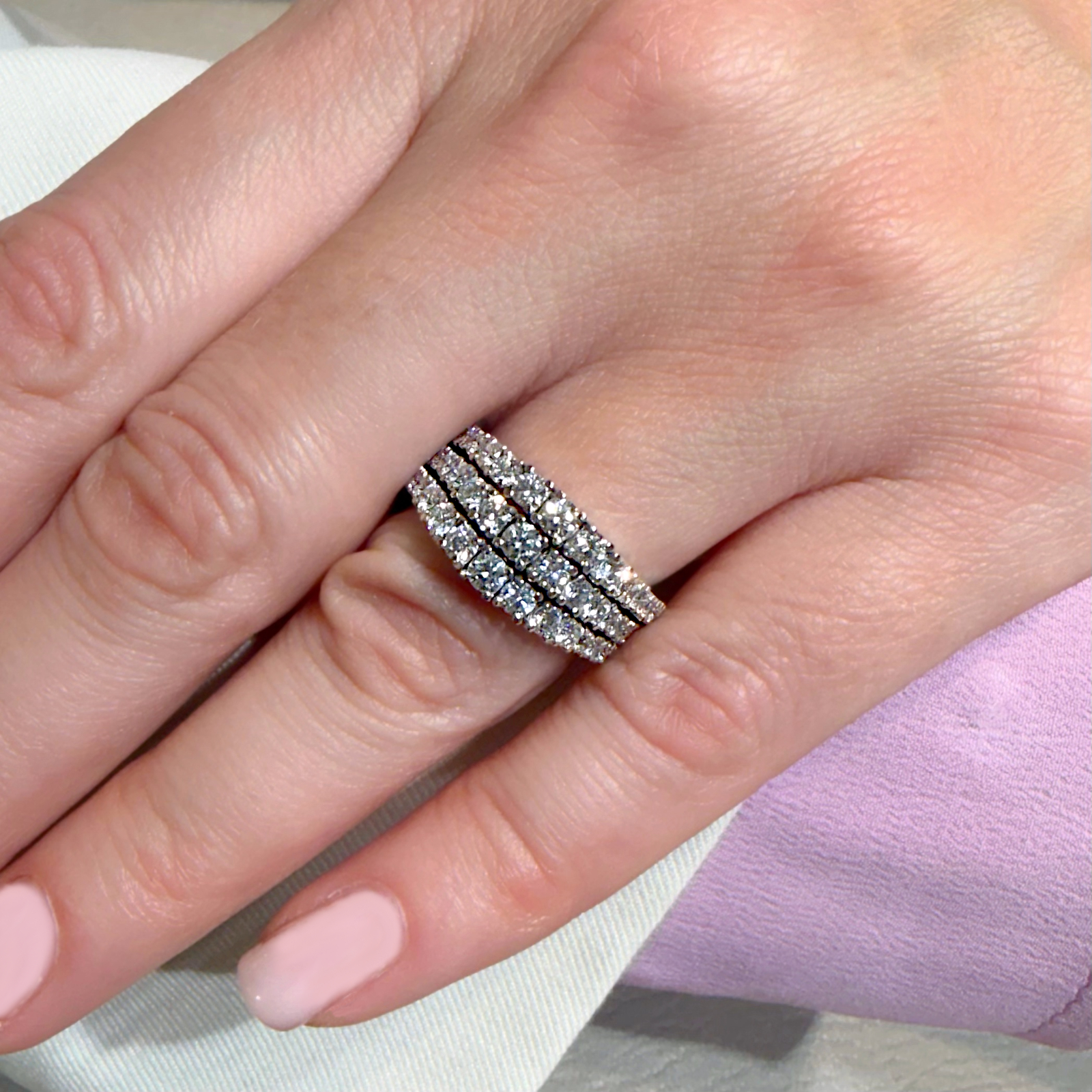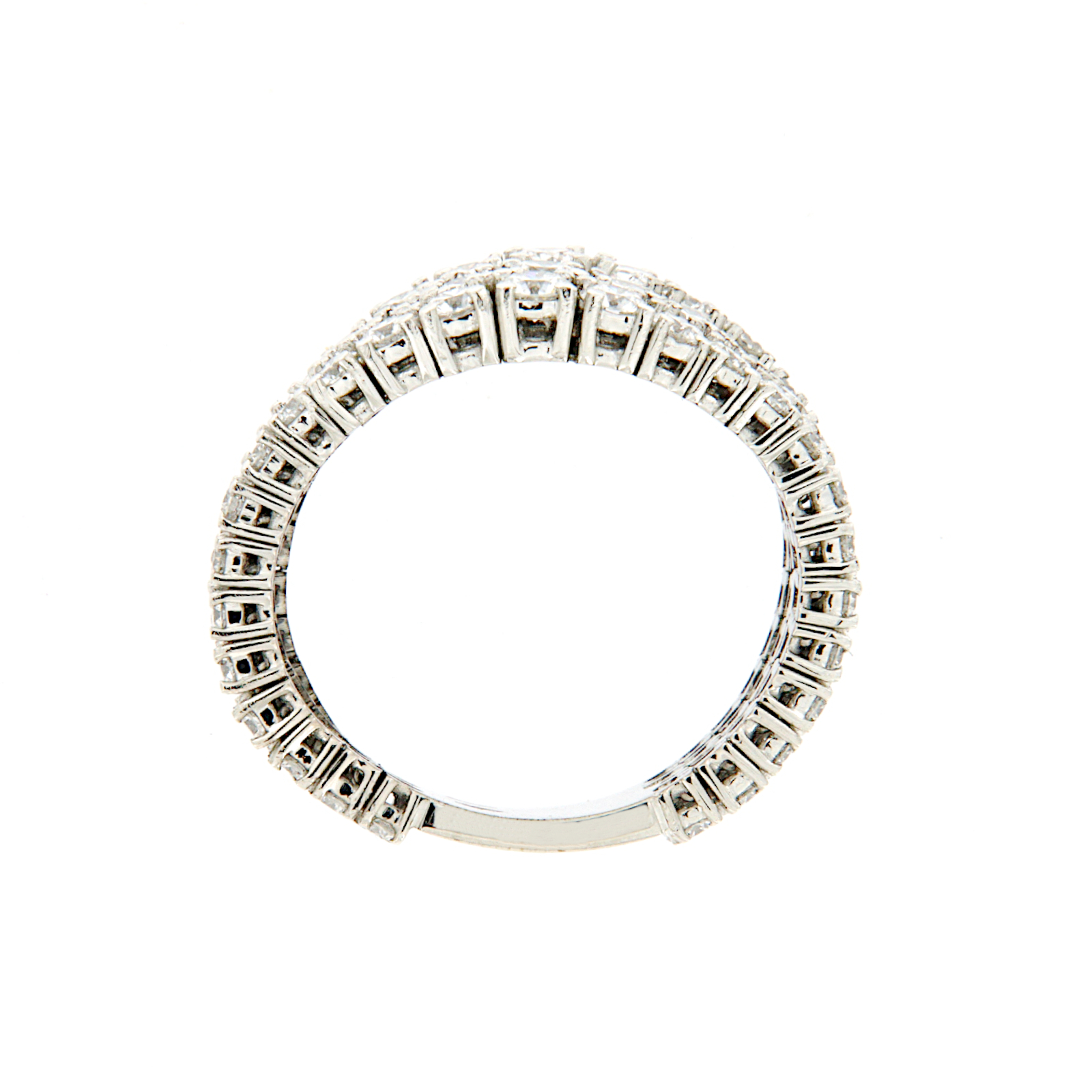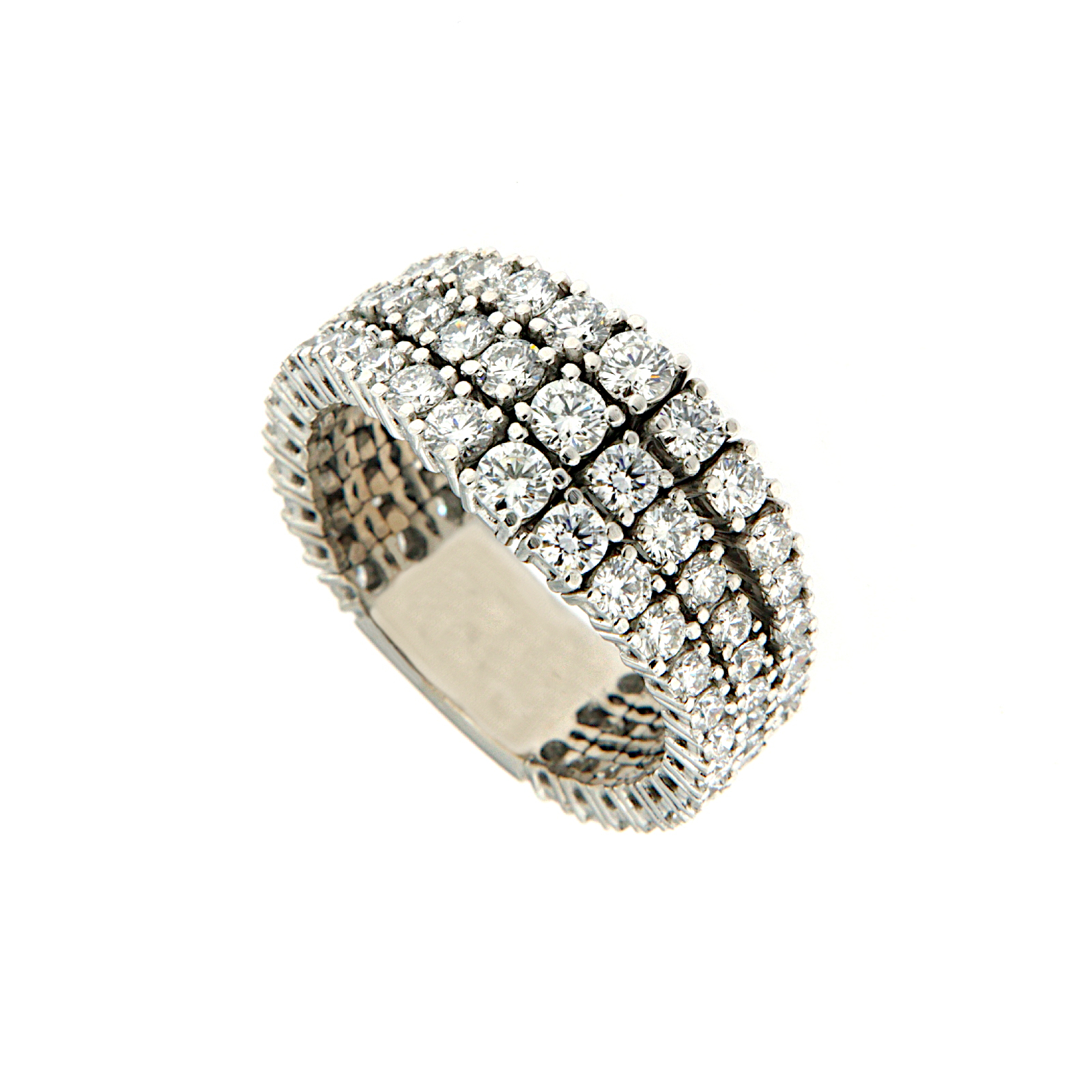 Anello morbido a tre file tennis in oro bianco con castoni a quattro punte tonde con incassati con misure a degradare diamanti taglio brillante.