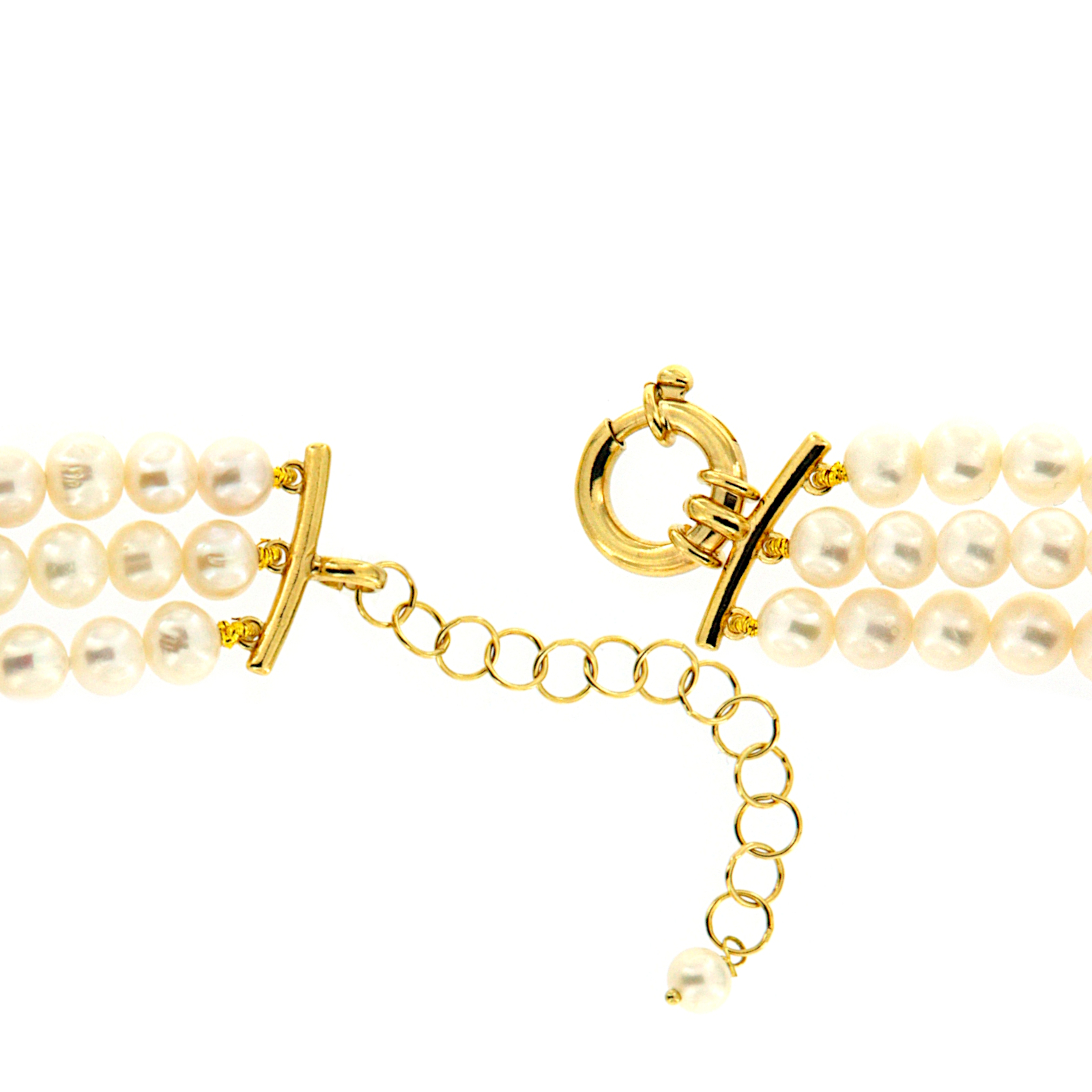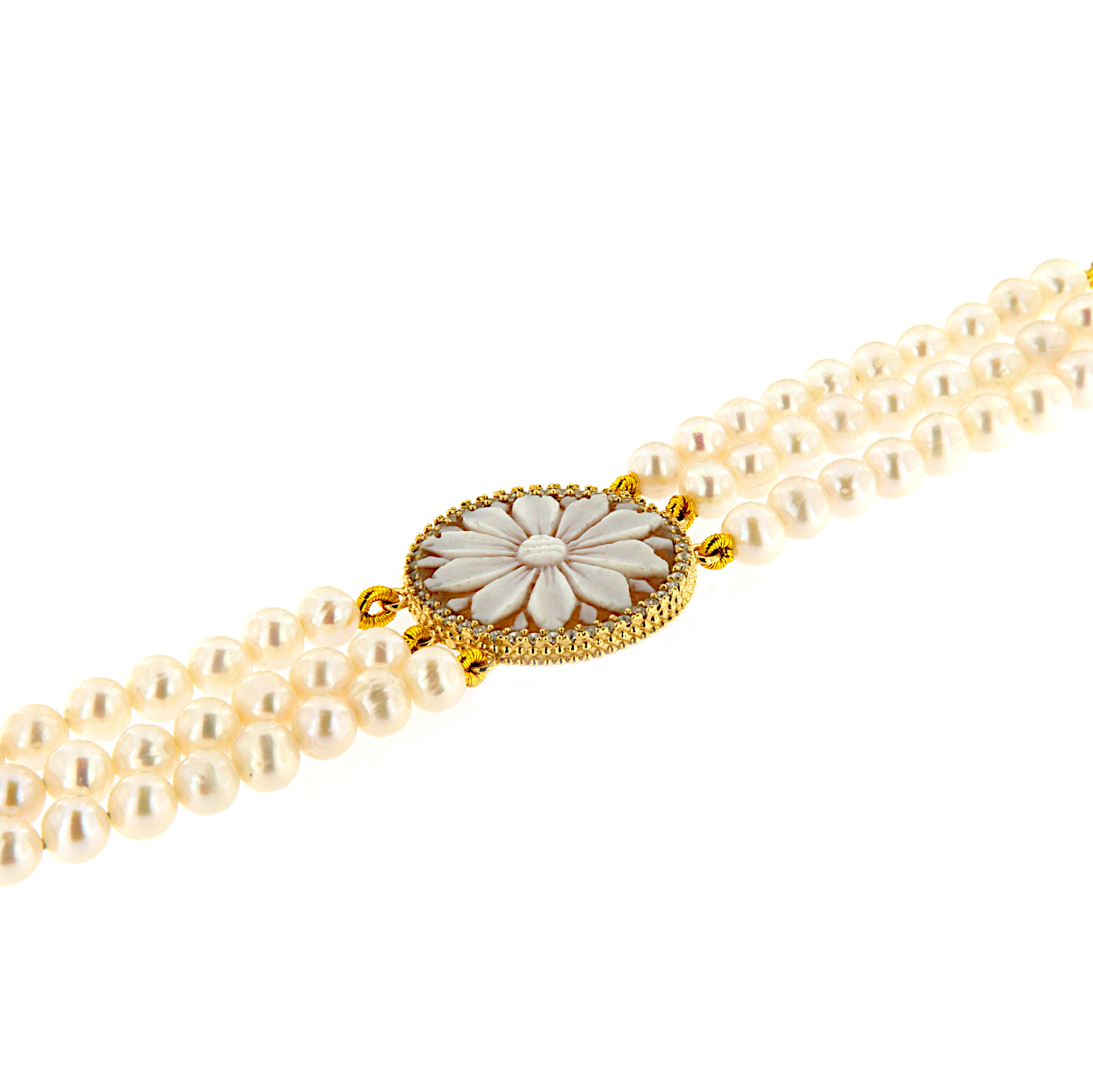 Bracciale a tre fili di perle coltivate di acqua dolce con centrale in argento dorato e cammeo circondato da zirconi. Chiusura con catena ad anelli per una perfetta vestibilità.