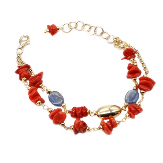 Bracciale a doppio filo maglia rollò in argento dorato, coralli e cianite.
