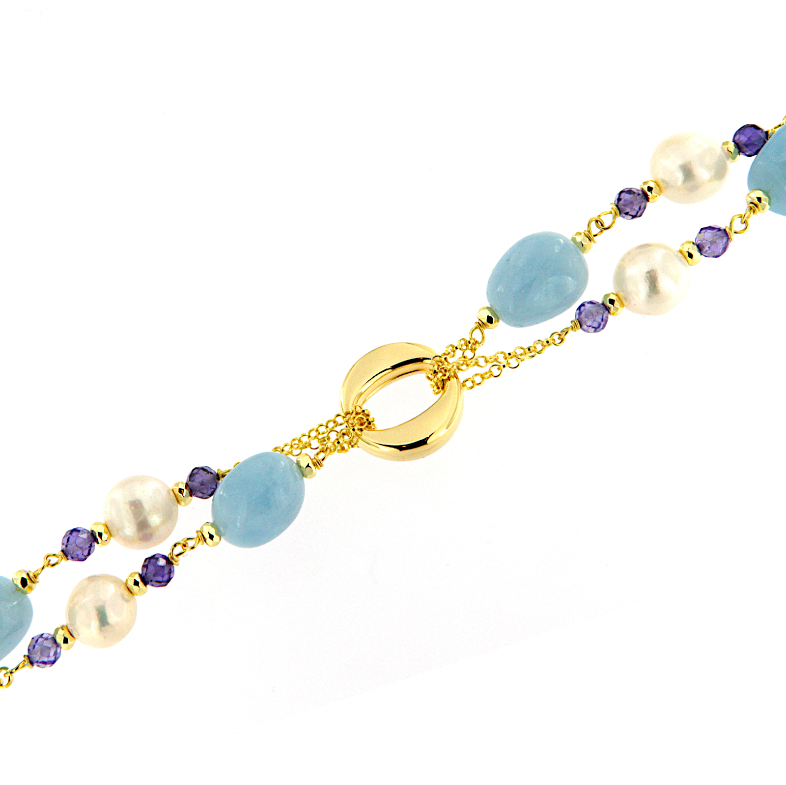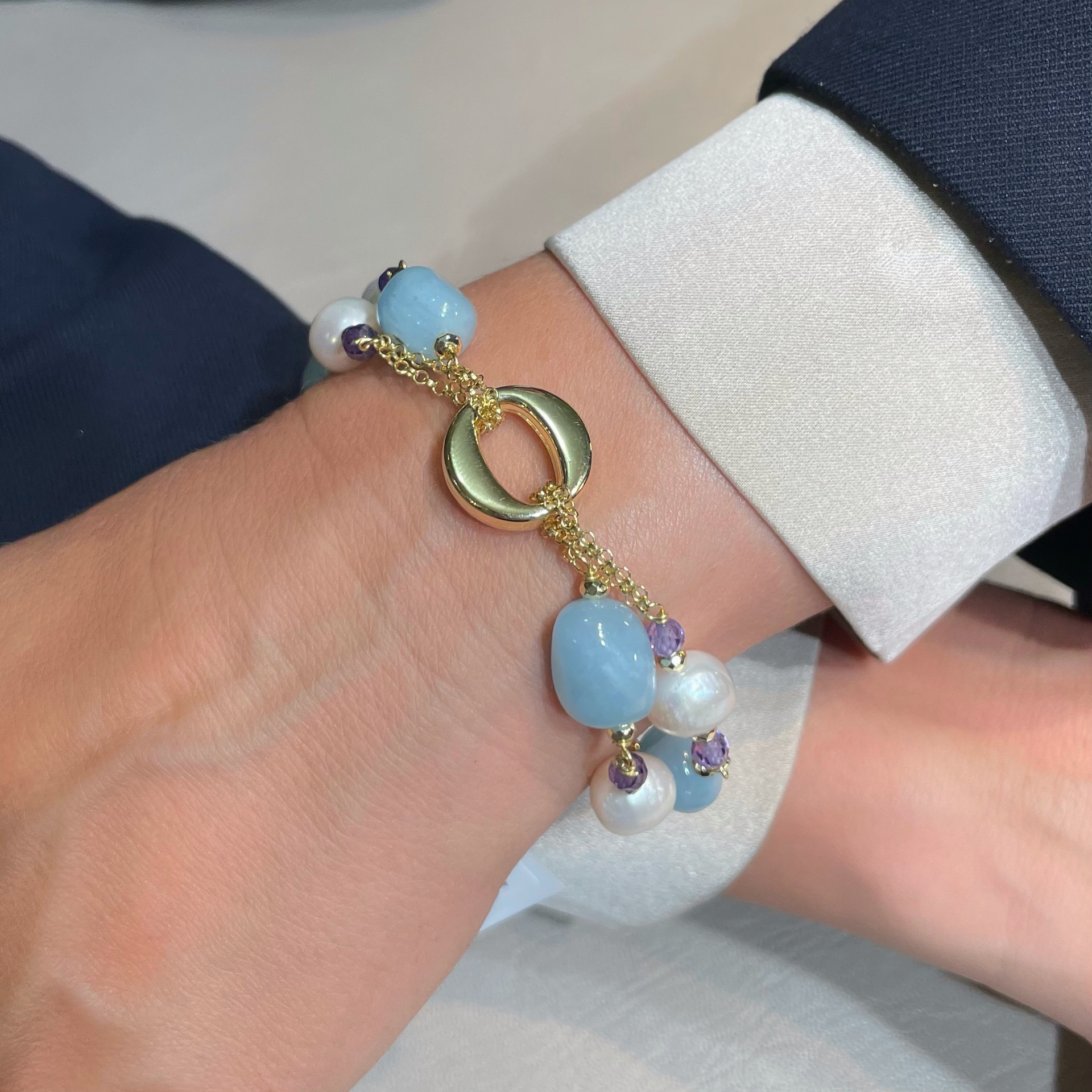 Bracciale a catena con maglie ovali scatolate in argento dorato, sassi di ametisa, perle coltivate d'acqua dolce e zirconi viola. chiusura con catena ad anelli per regolerne la misura