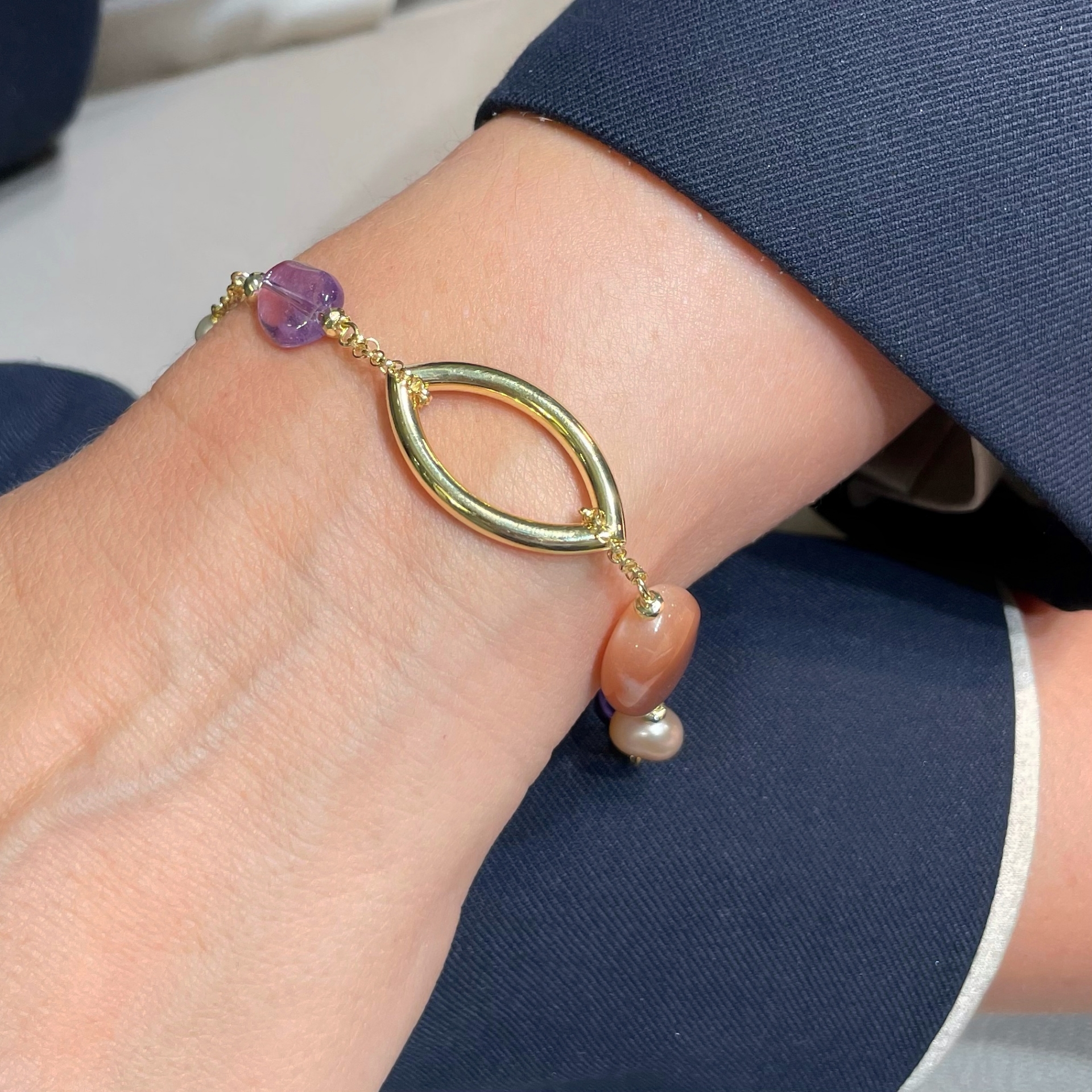 Bracciale a catena con maglie ogivali in argento dorato, sassi di ametista, perle coltivate di acqua dolce rosate e moonstone. Chiusura con catena ad anelli per regolarne la misura.