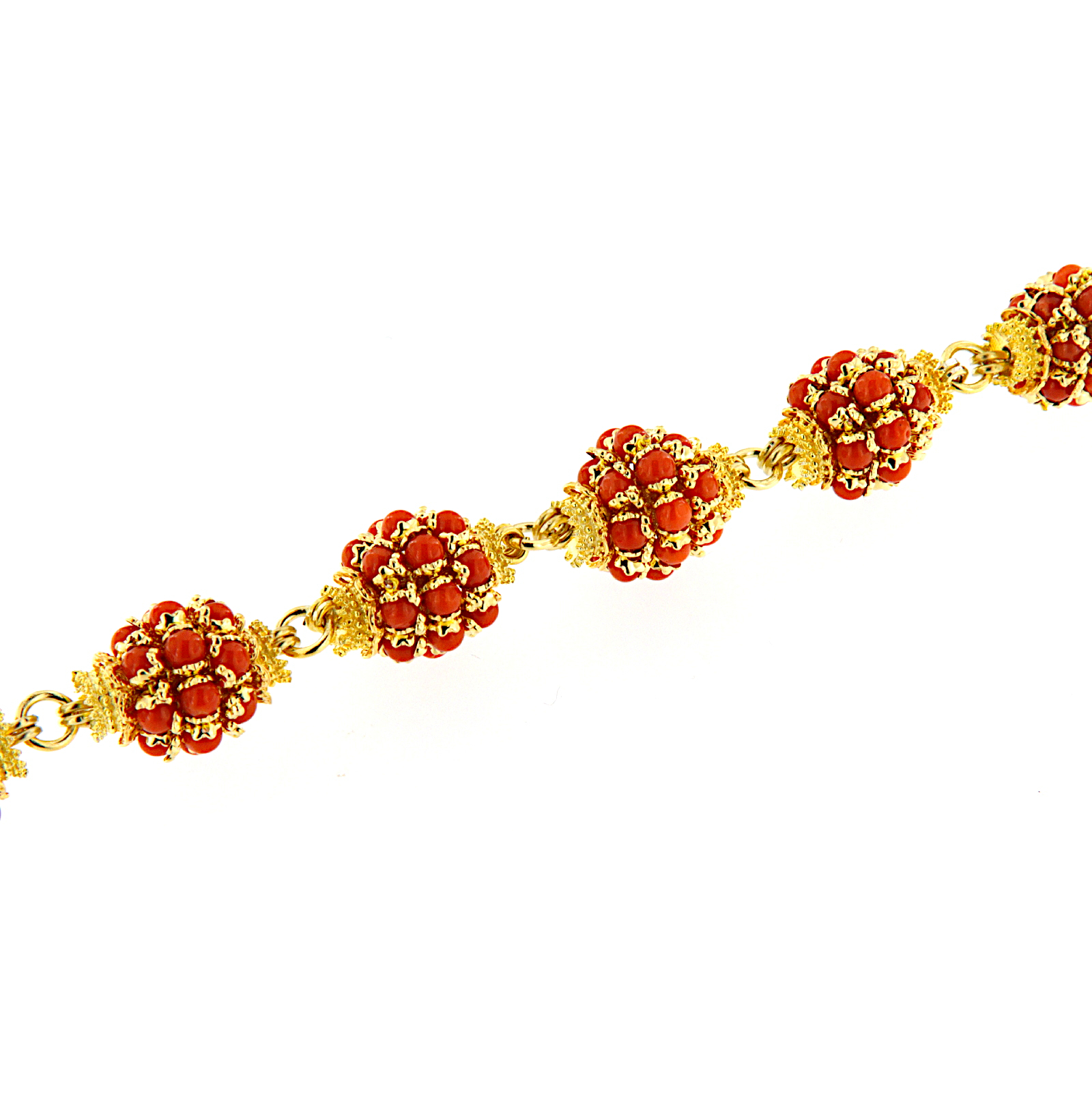 Bracciale in argento dorato a maglia bizantina con sei more finemente realizzate con piccole sfere di corallo rosso.