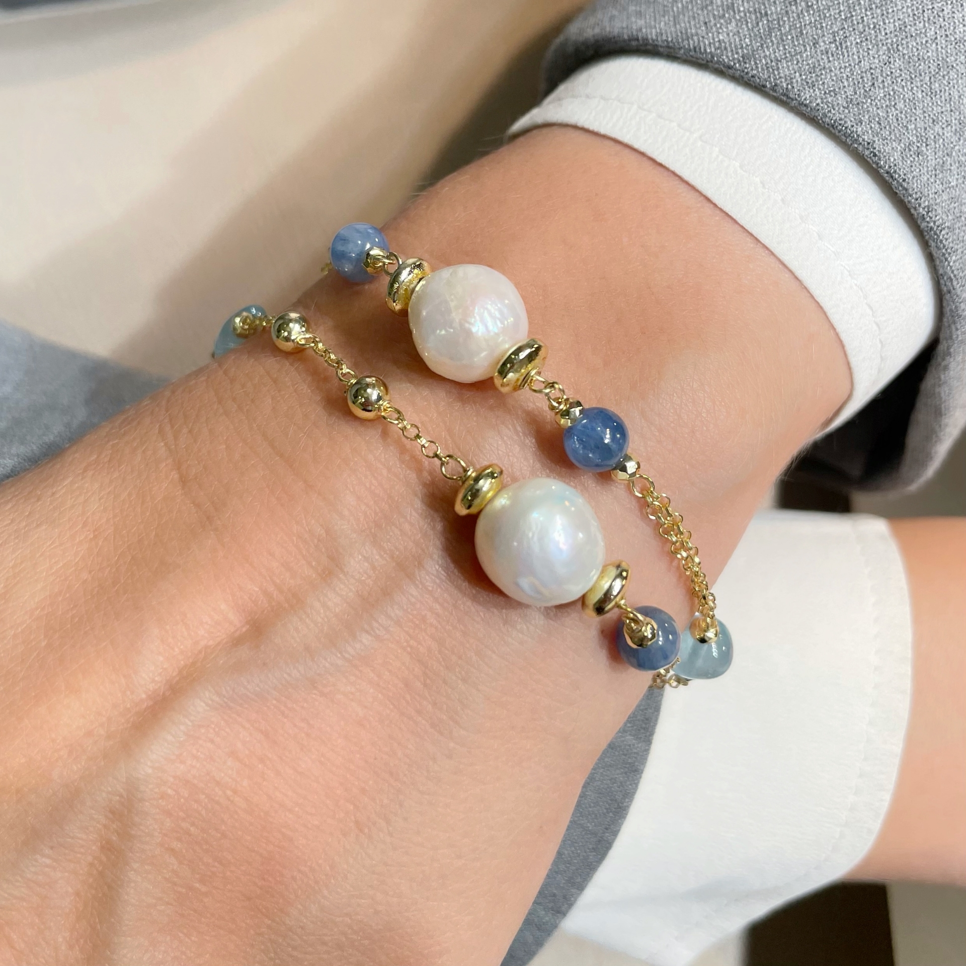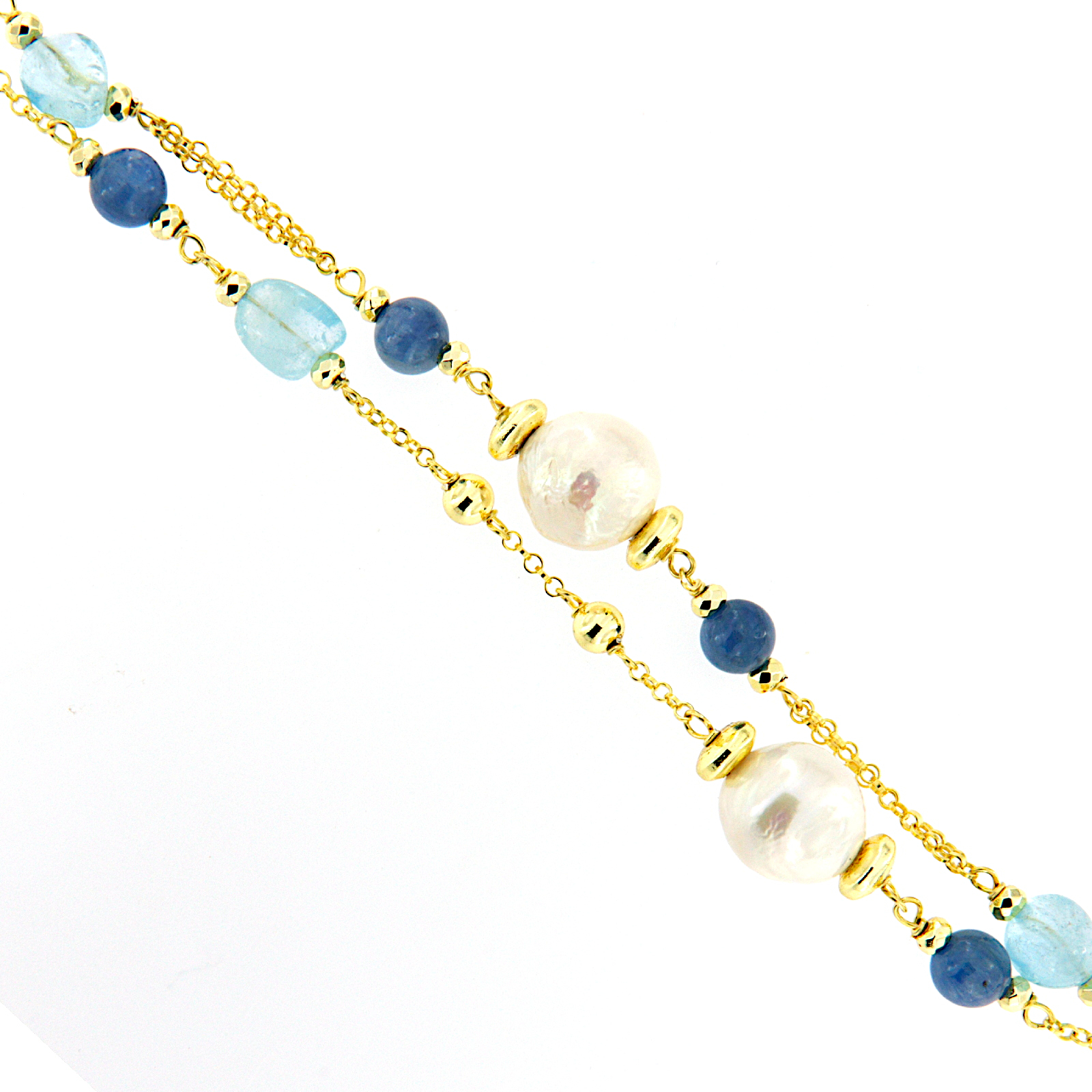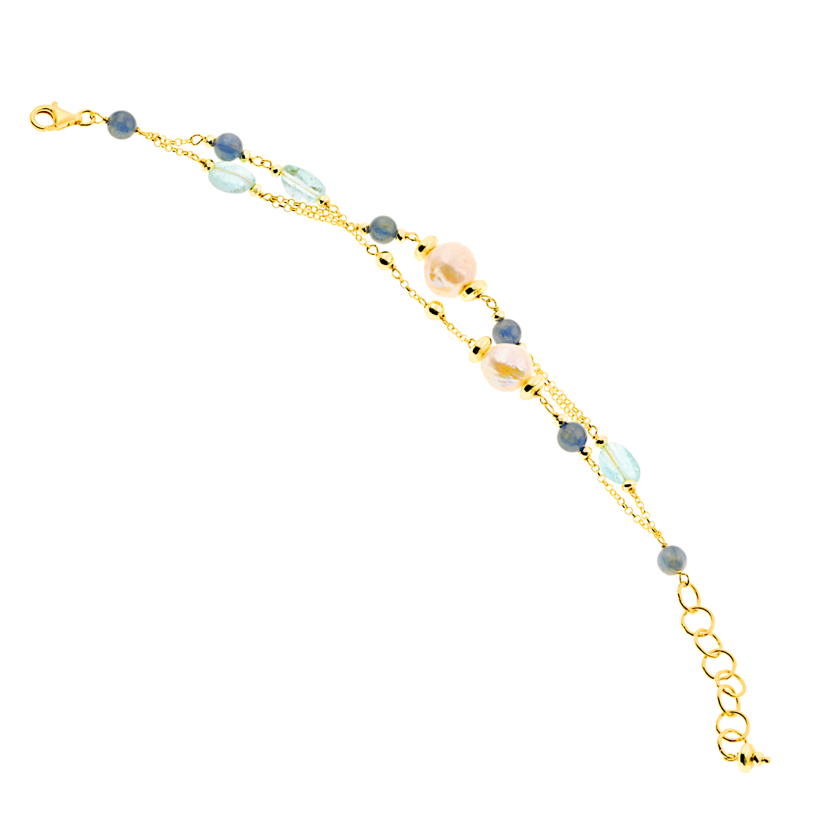 Bracciale a doppia catena in argento dorato, sassi di topazio azzutto, perle coltivate di acqua dolce e sfere di cianite. Chiusura con catena ad anelli per regolarne la misura.