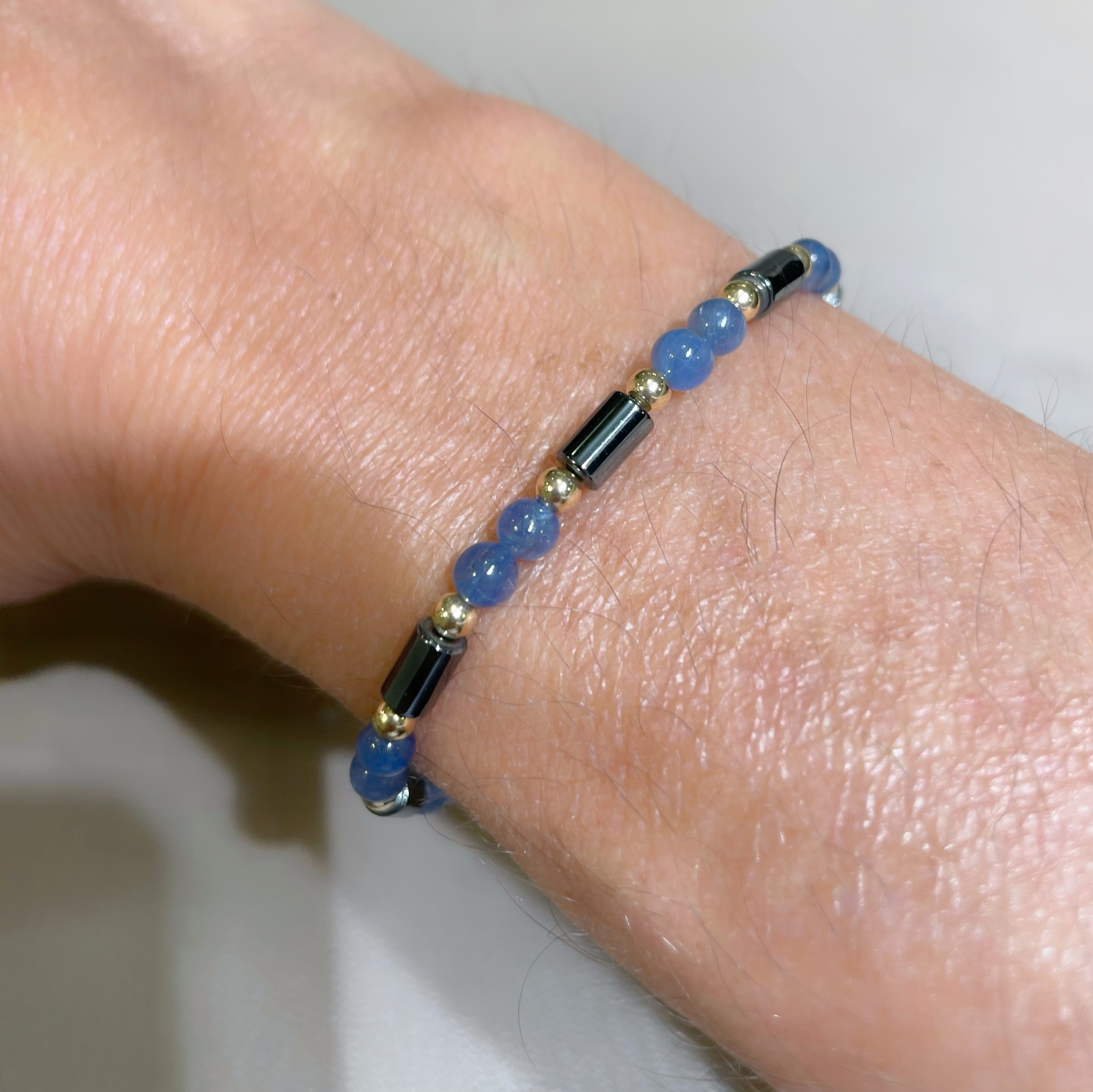 Bracciale con palline in orogiallo, iolite e cilindri di ematite. chiusura regolabile con cordino in acetato