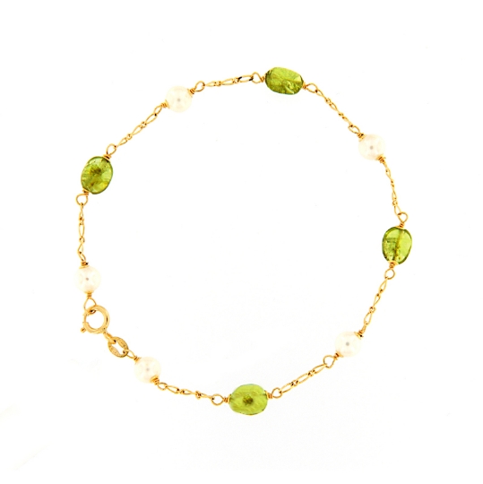 Bracciale a catena in oro giallo con alternate perle coltivate di acqua dolce di mm. 5,50/6,00 e sassi ovali di peridoto.