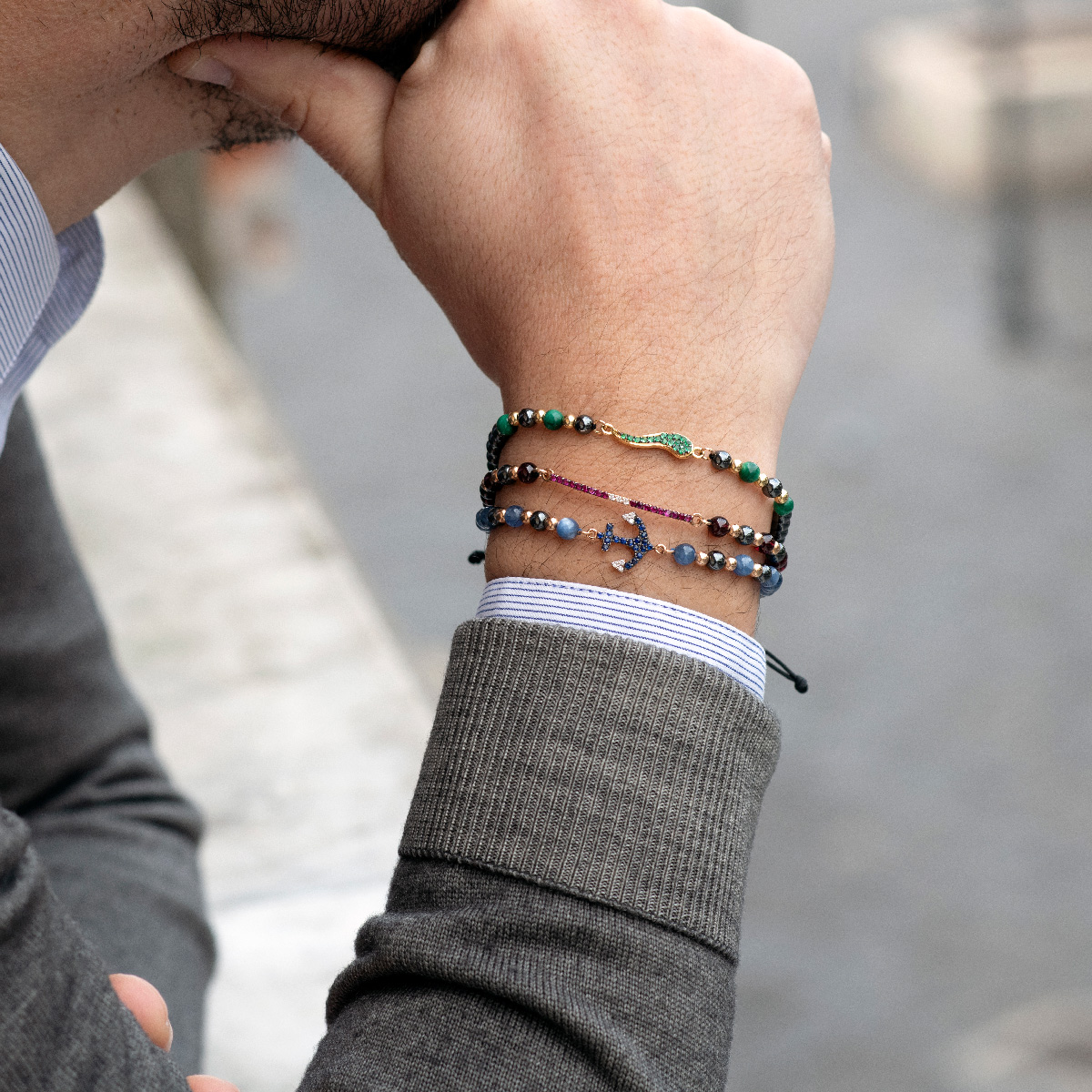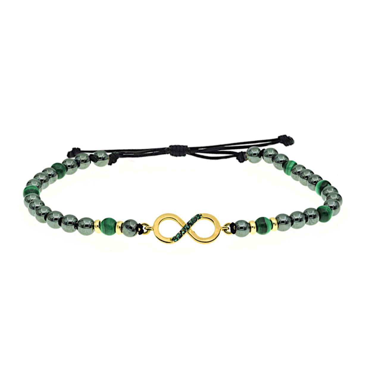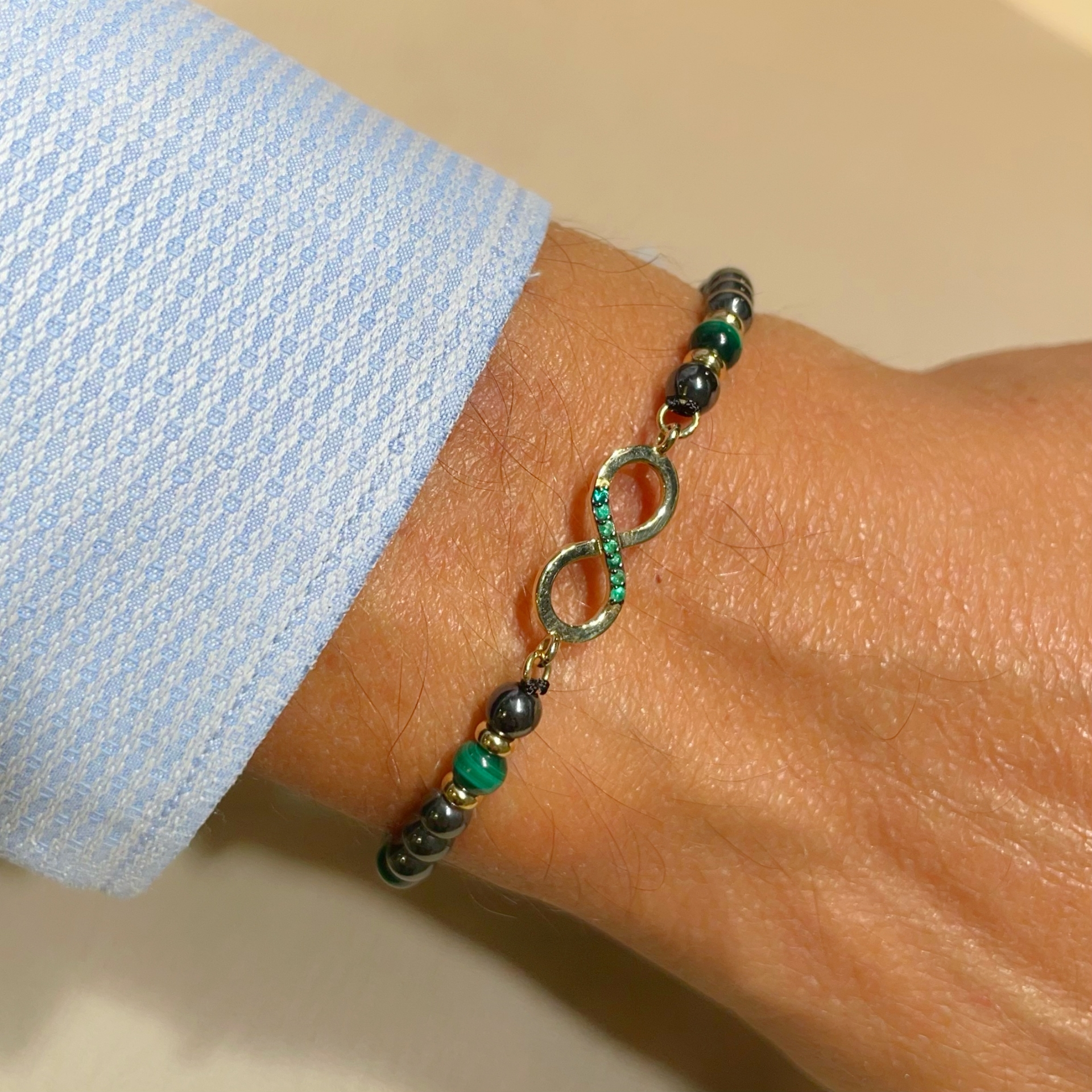 Bracciale con simbolo infinito in oro giallo e smeraldi, completato da sfere di ematite, malachite.