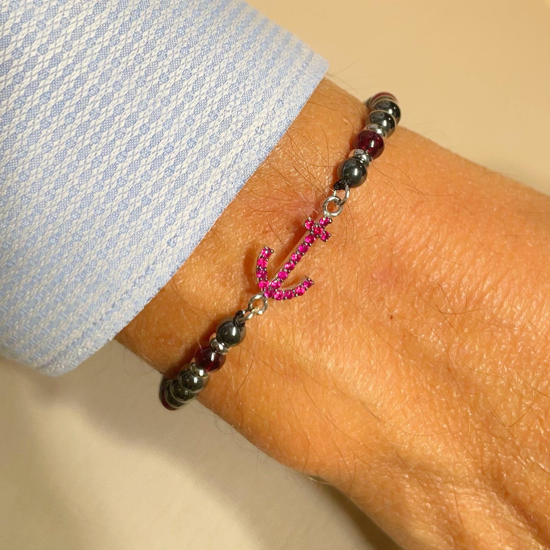 Bracciale con simbolo ancora in oro bianco con rubini, completato da sfere ematite, rodolite.