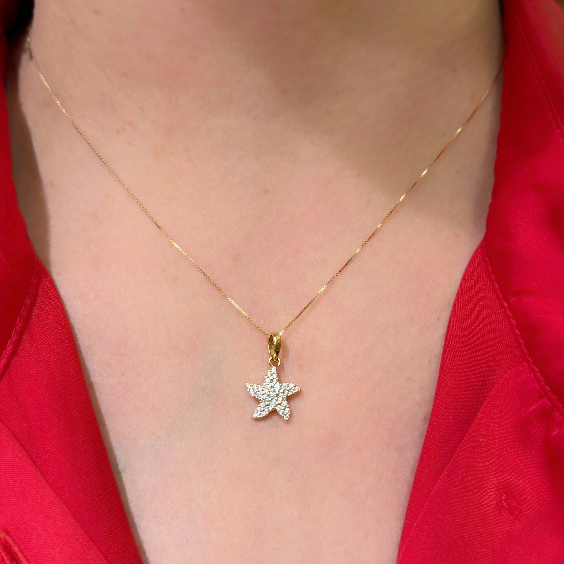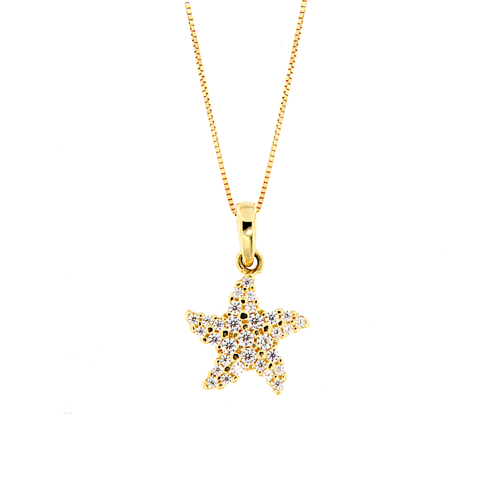 Collana con pendente a forma di stella marina in oro giallo con incassato un pavè di zirconi. Girocollo a maglia veneziana con doppio anellino di chiusura per regolarne la lunghezza.