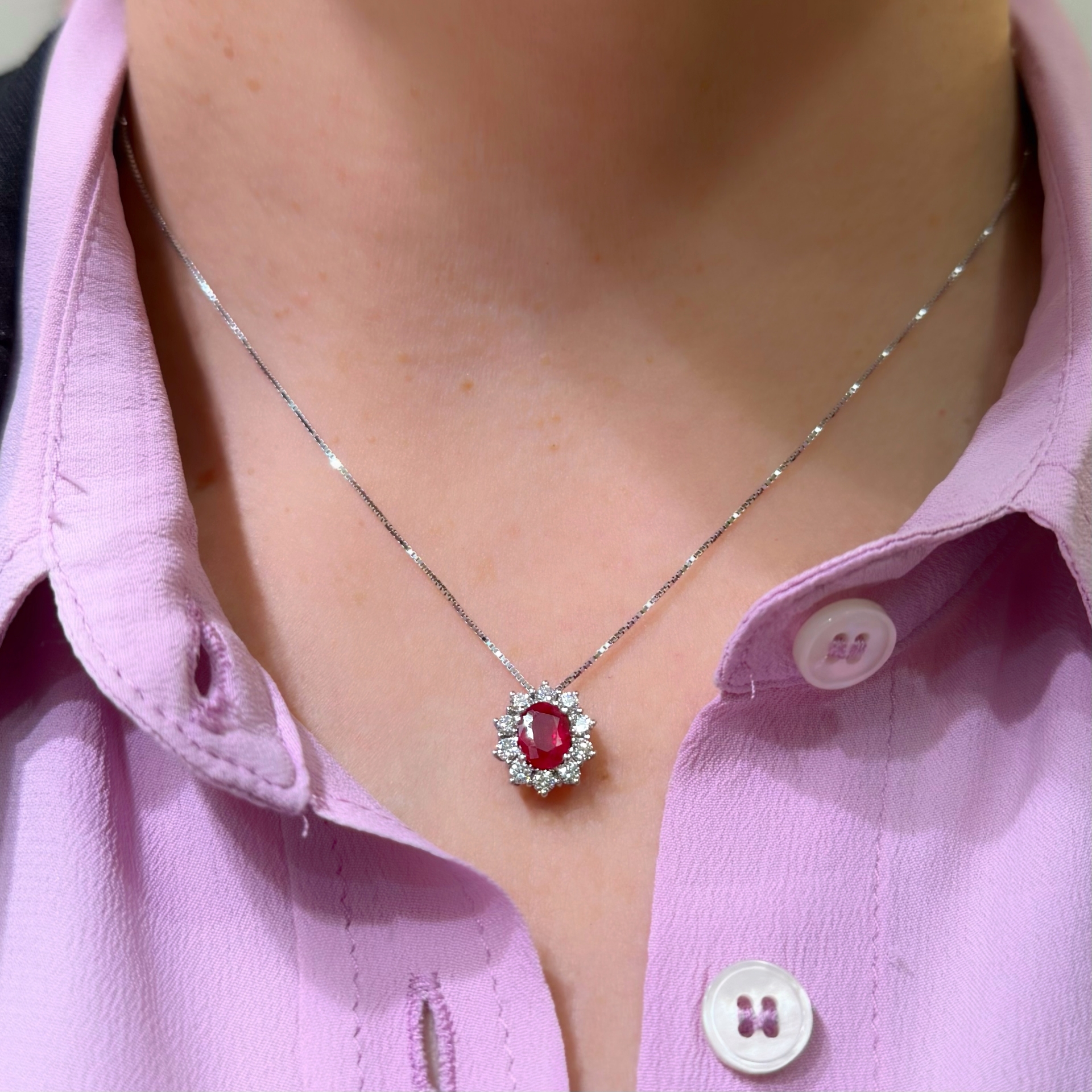 Pendente in oro bianco con incassato rubino taglio ovale con contorno diamanti taglio brillante. Girocollo in oro bianco maglia veneziana con doppio anellino di chiusura per una lunghezza di cm. 42 o 45.