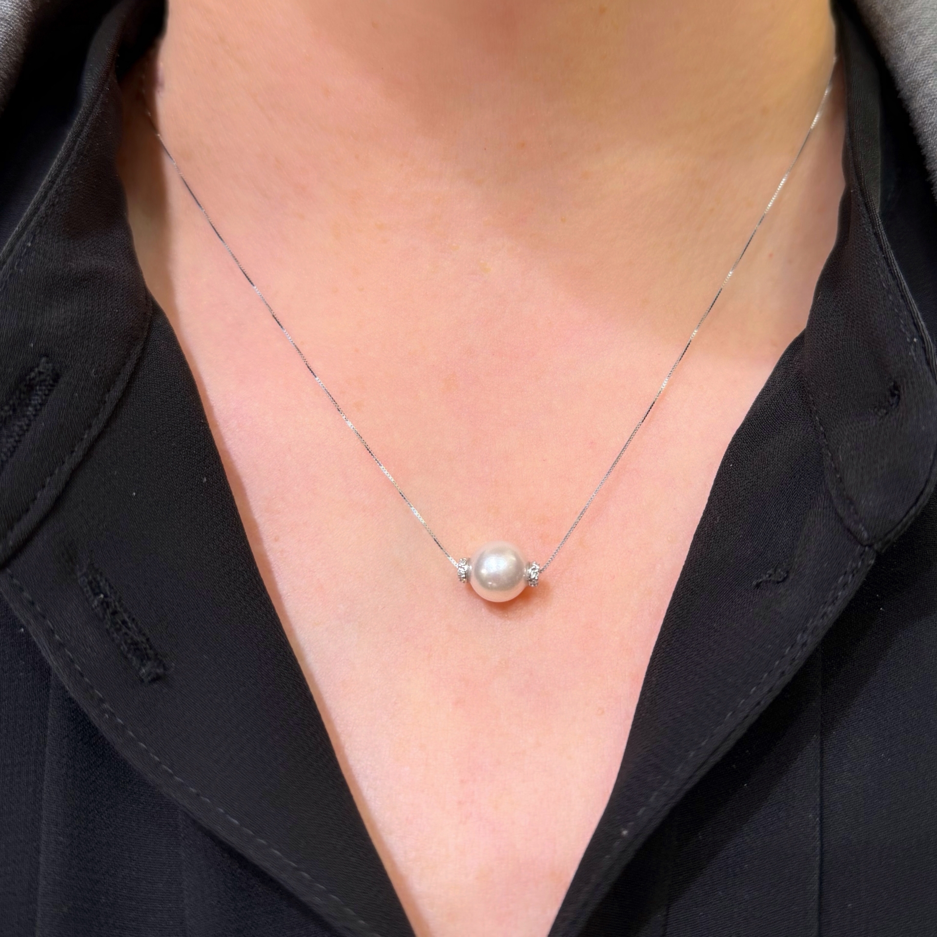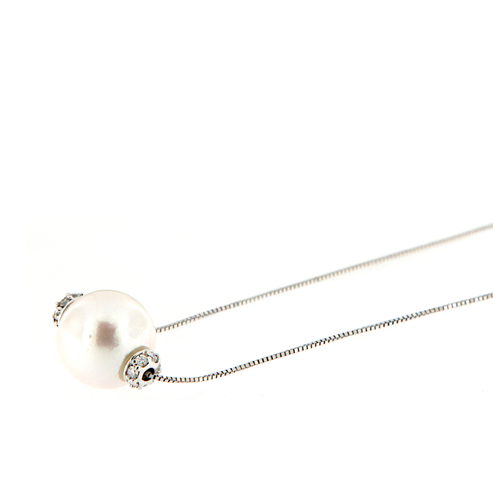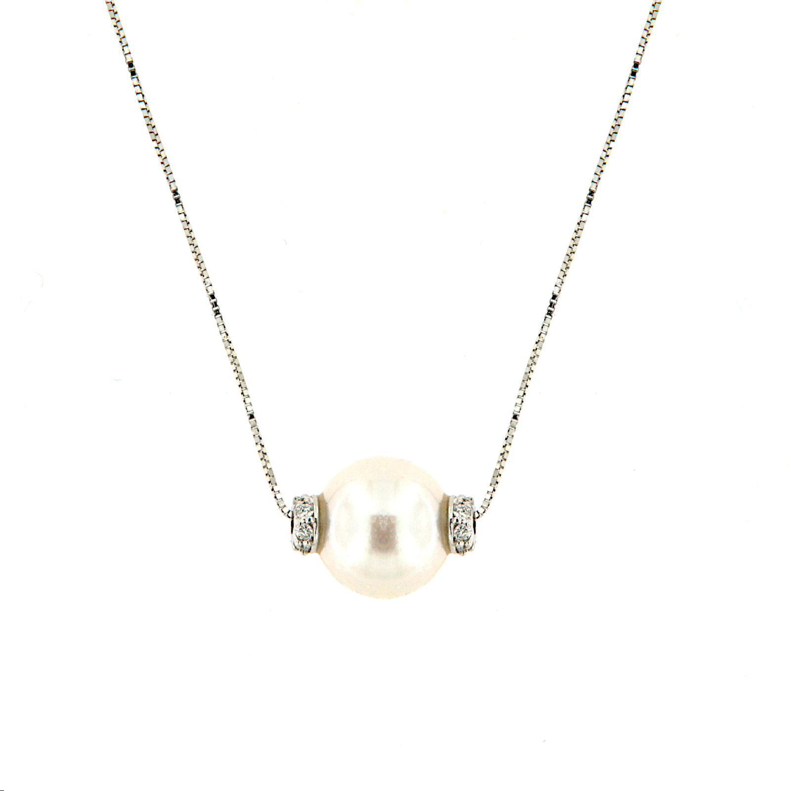 Collana in oro bianco con perla giapponese coltivata e passanti laterali con incassati diamanto taglio brillante.