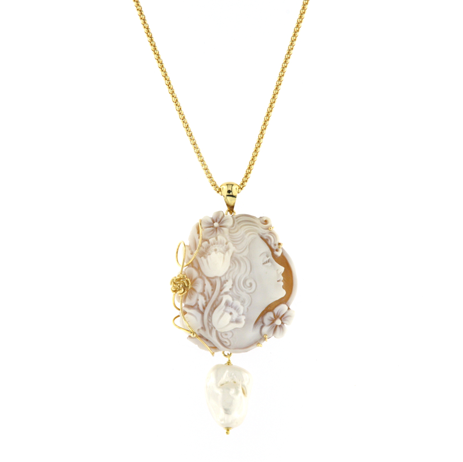 Collana in argento dorato a maglia tubolare a chicco di riso con pendente in cammeo (con disegno floreale con perla coltivata d'acqua dolce barocca.
