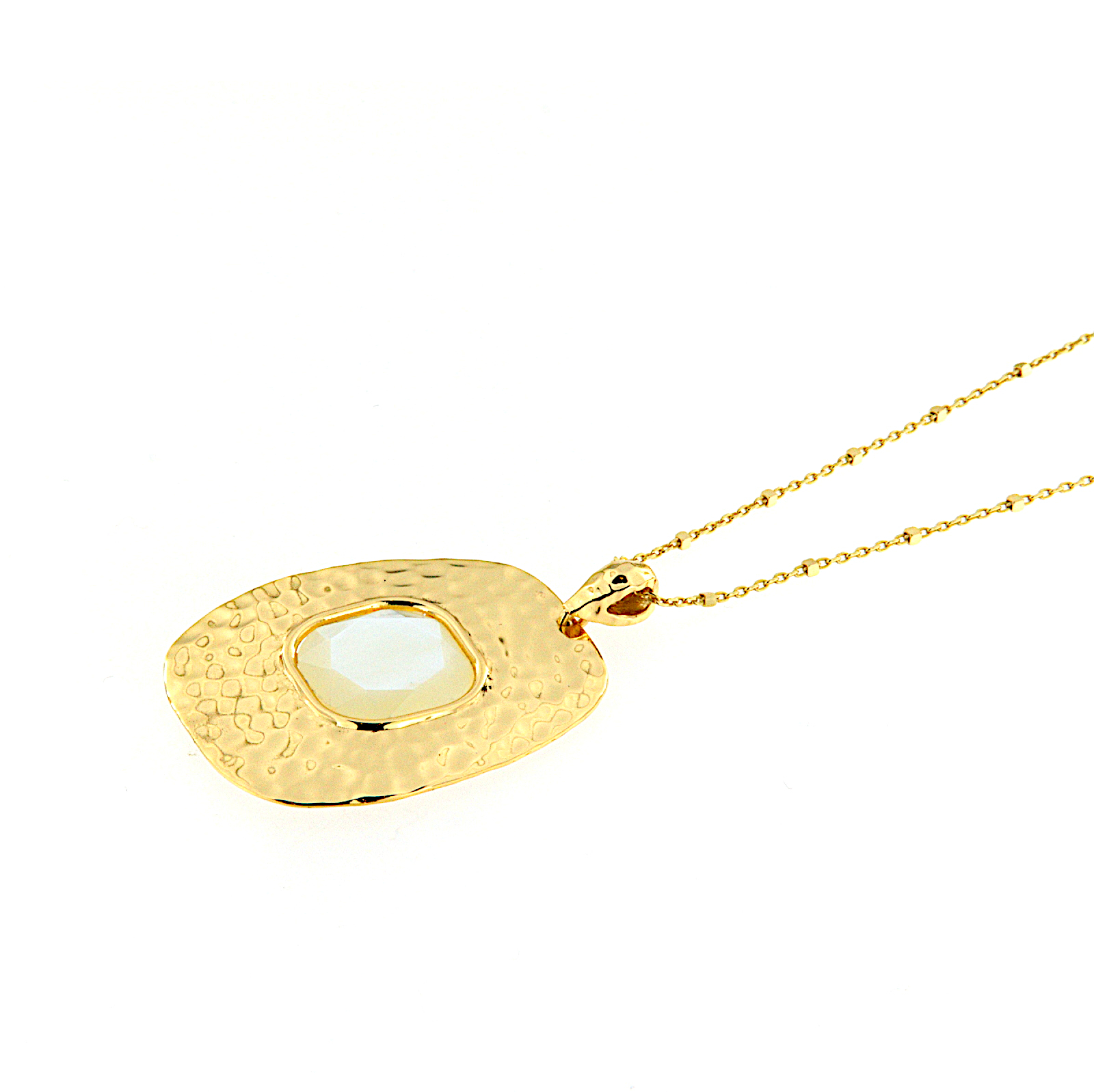 Collezione Nuova Retrò. Collana lunga con lastra in argento dorato con lavorazione martellata e madreperla
