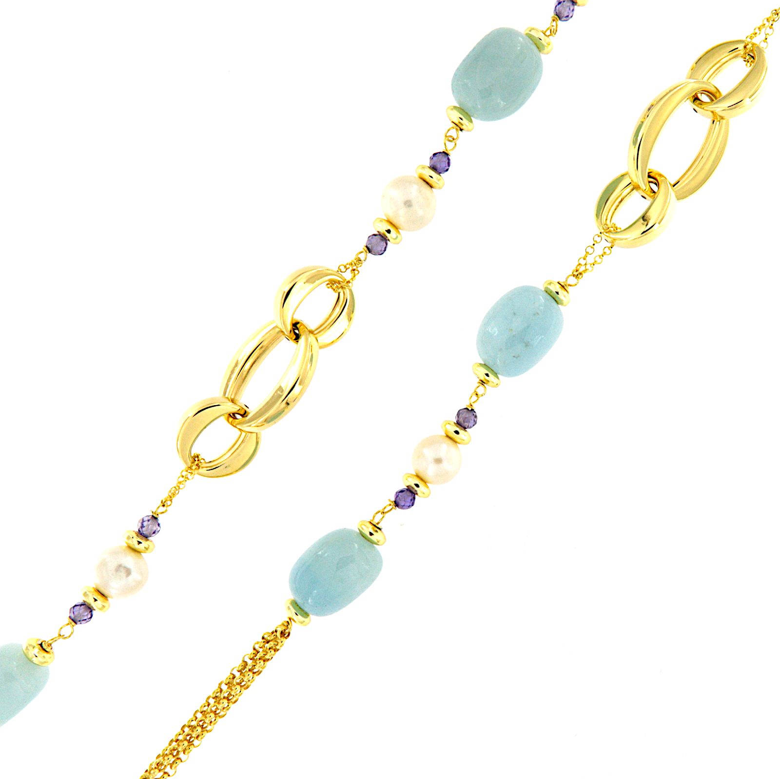 Collana lunga a catena con maglie ovali scatolate in argento dorato, sassi di ametisa, perle coltivate d'acqua dolce e zirconi viola.
