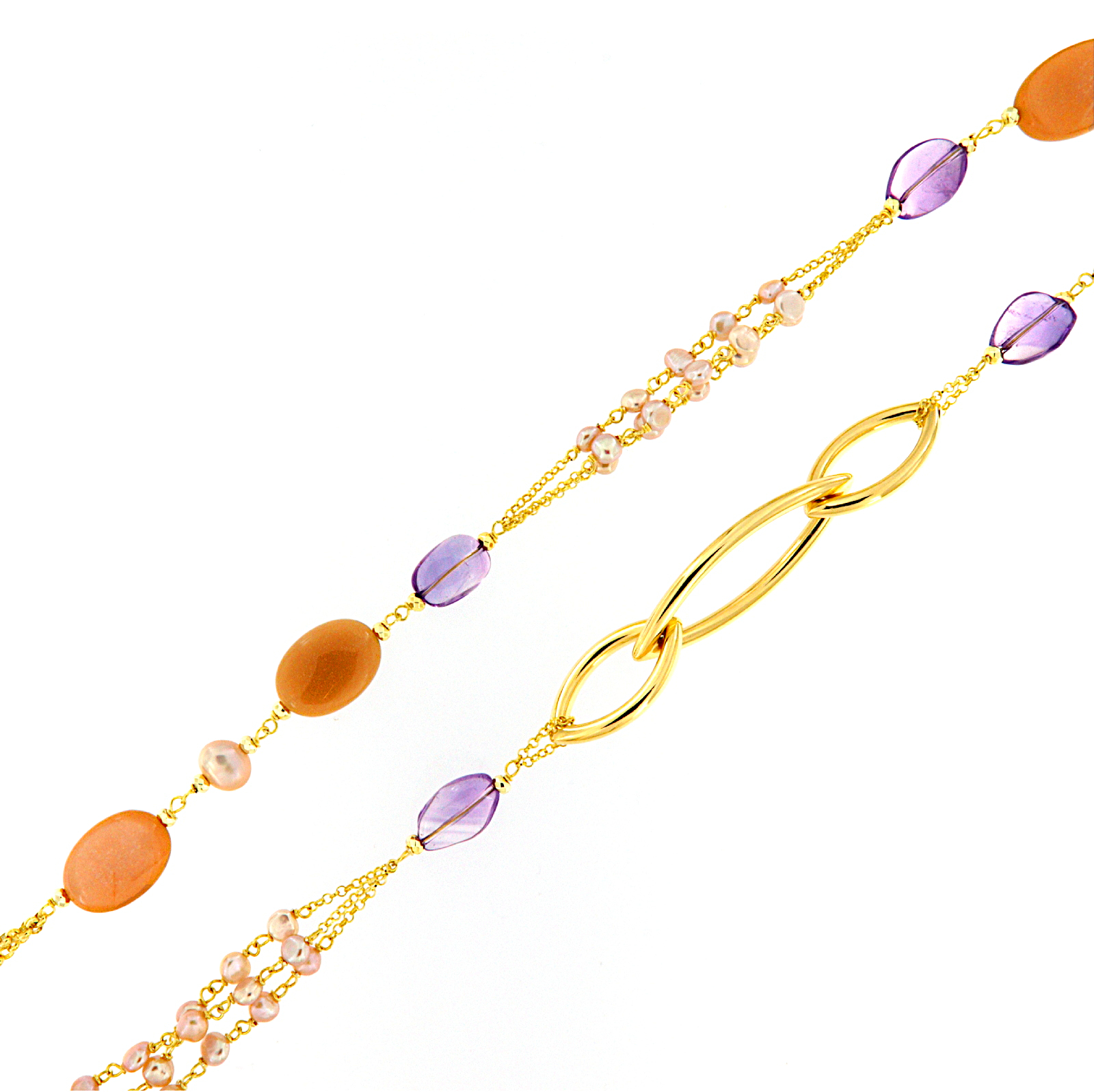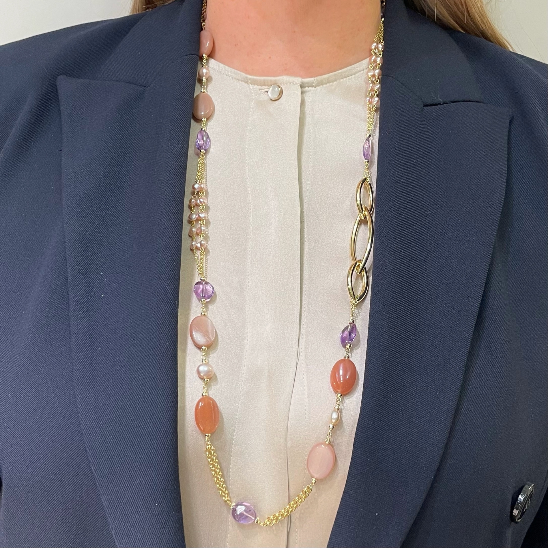 Collana lunga a catena con maglie ogivali in argento dorato, sassi di ametista, perle coltivate di acqua dolce rosate e moonstone.