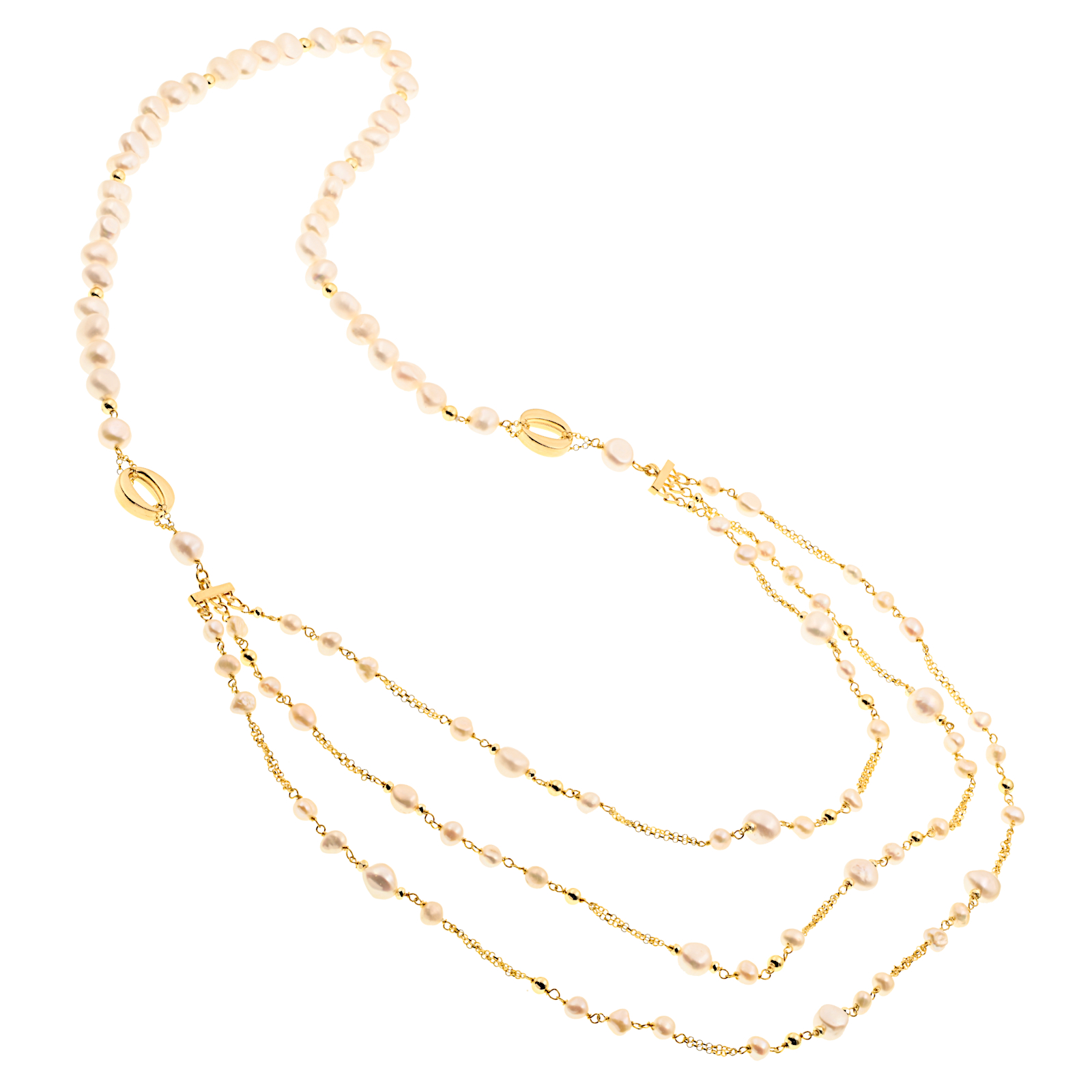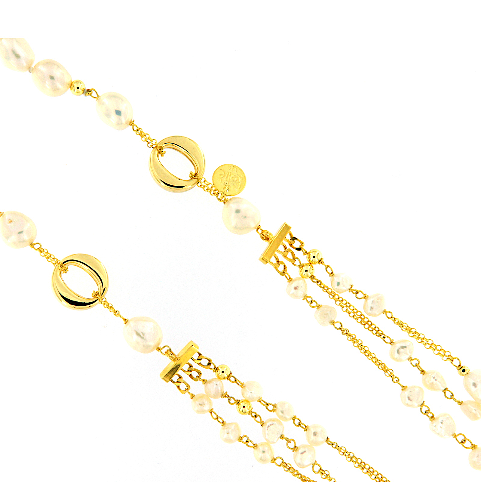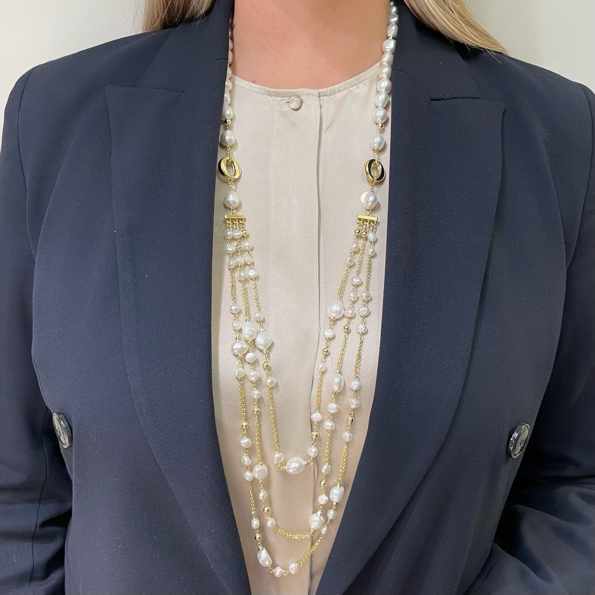 Collana lunga con perle coltivate barocche d'acqua dolce con catena finale a tre fili in argento con alternate perle di diverse misure.
