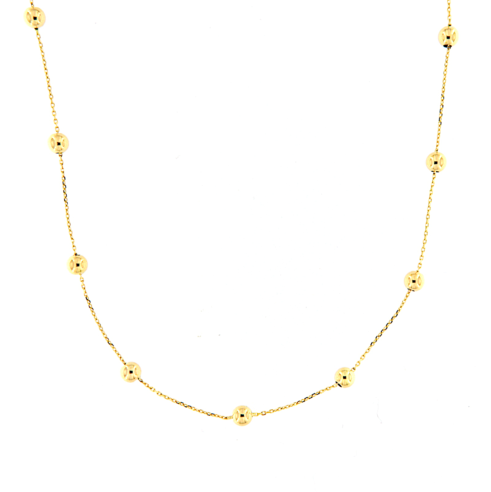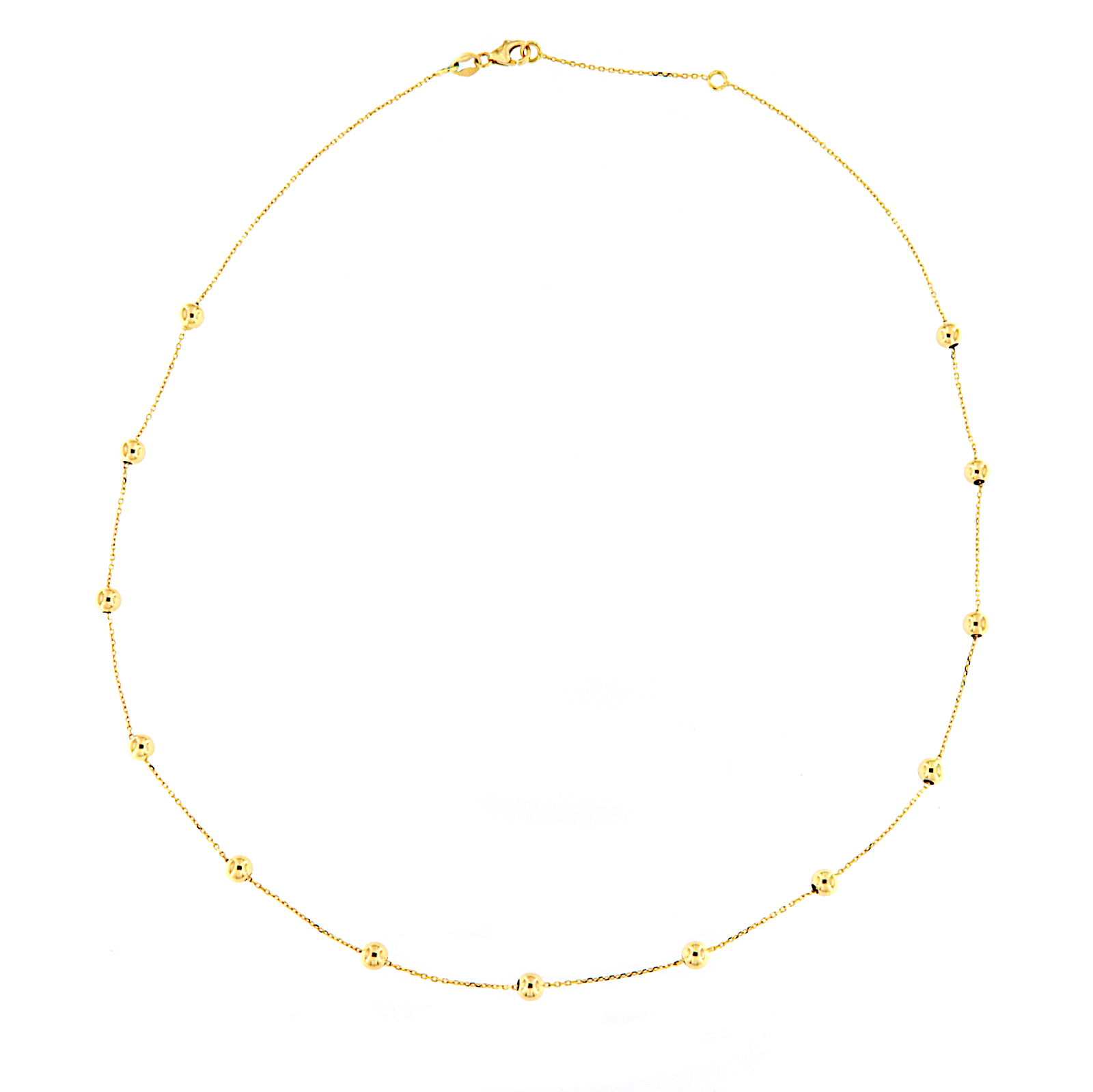 Collana a girocollo a maglia rollò sottile con alternatete sfere lucide in oro giallo. Chiusura con doppio anellino per regolarne la lunghezza.