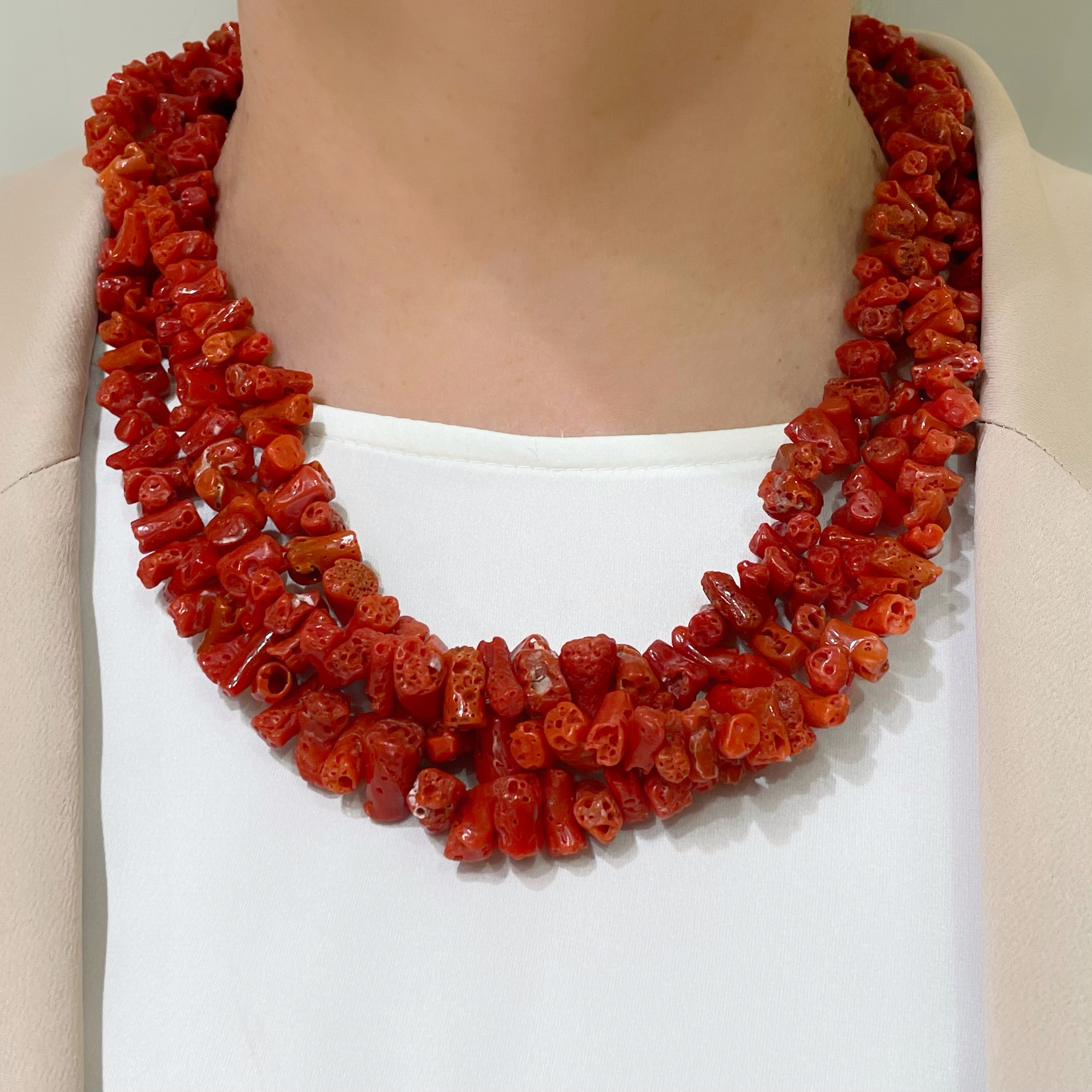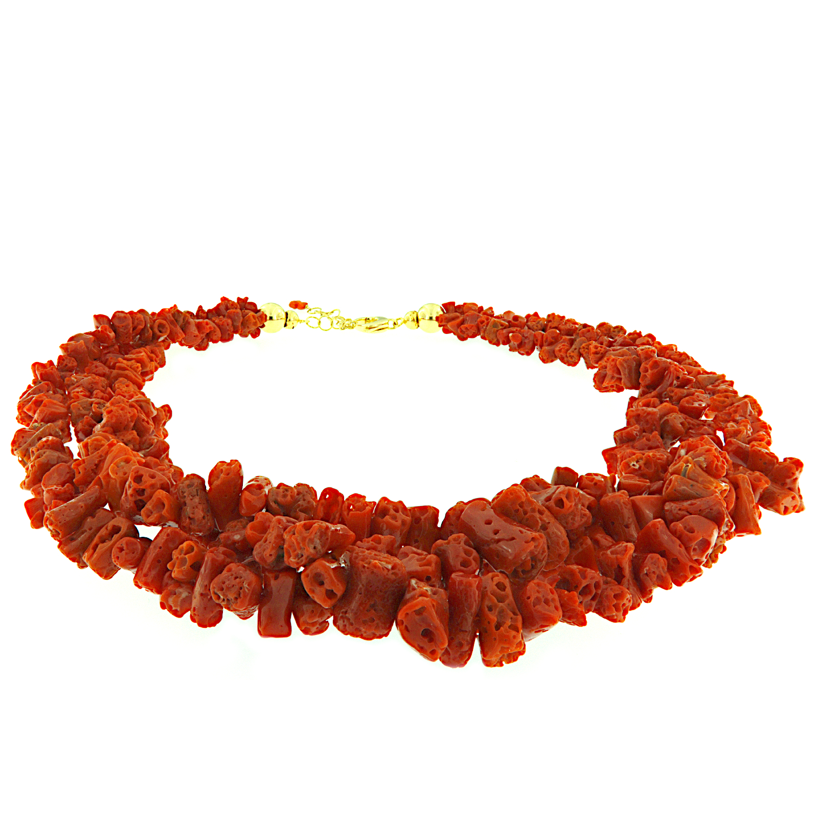 Collana a tre fili degradare di corallo mediterraneo irregolare con chiusura argento dorato.
