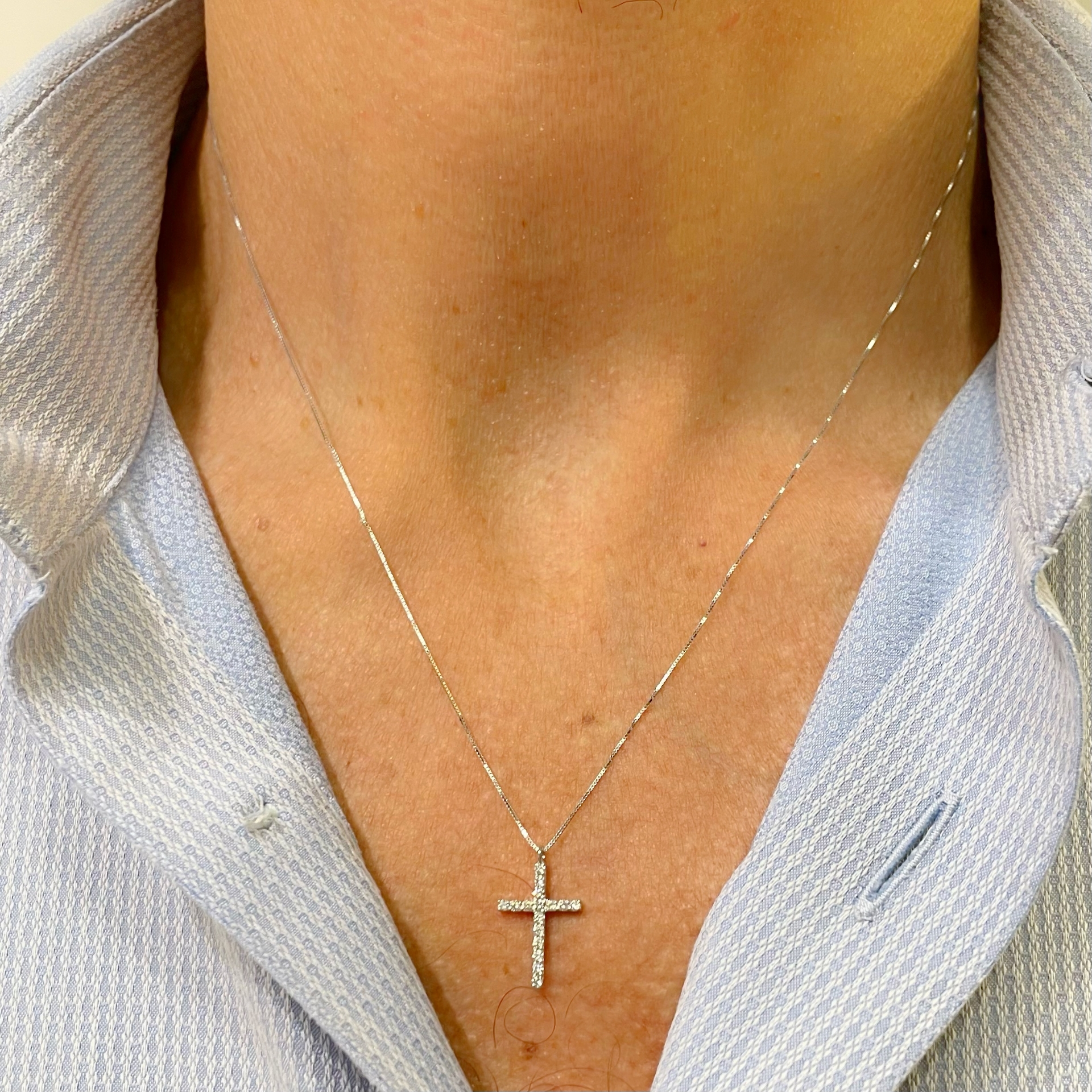 Collana sottile in oro bianco e croce con diamanti taglio brillante.