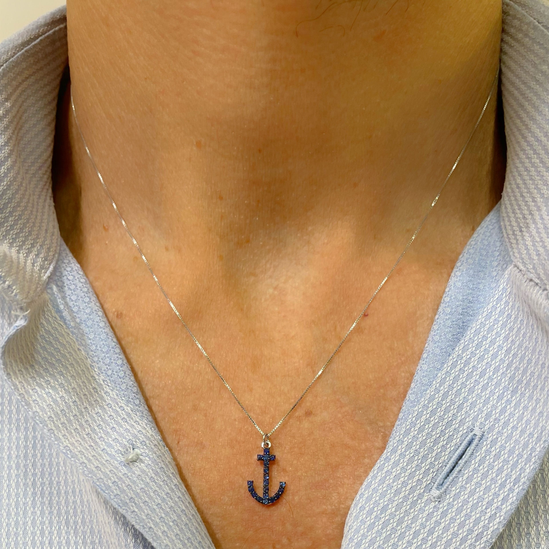 Collana sottile in oro bianco con pendente ad ancora con incassati zaffiri.