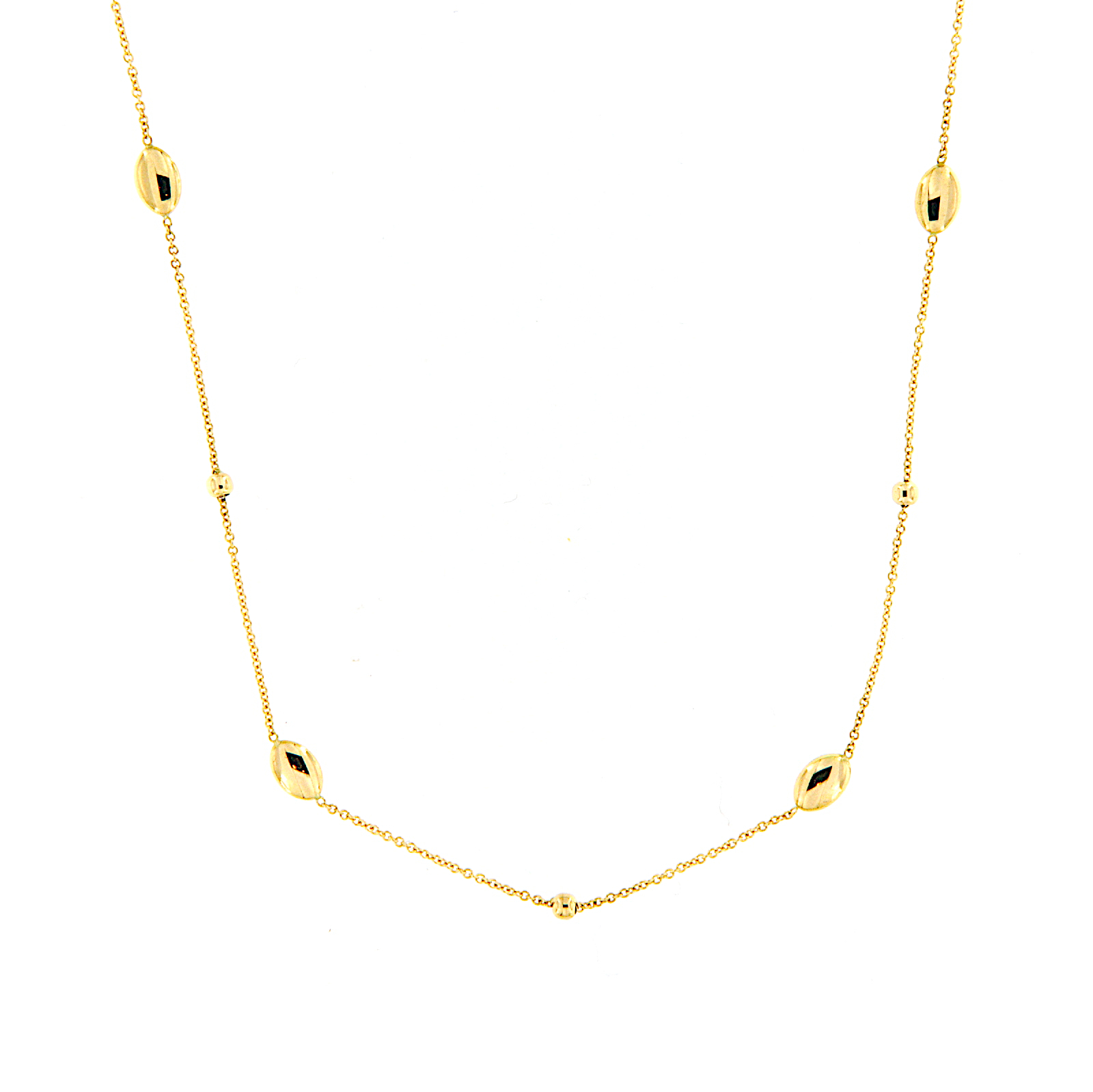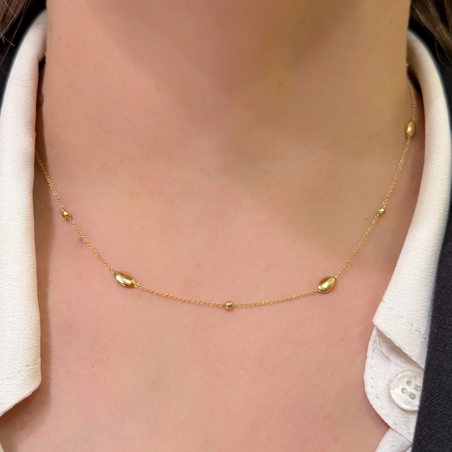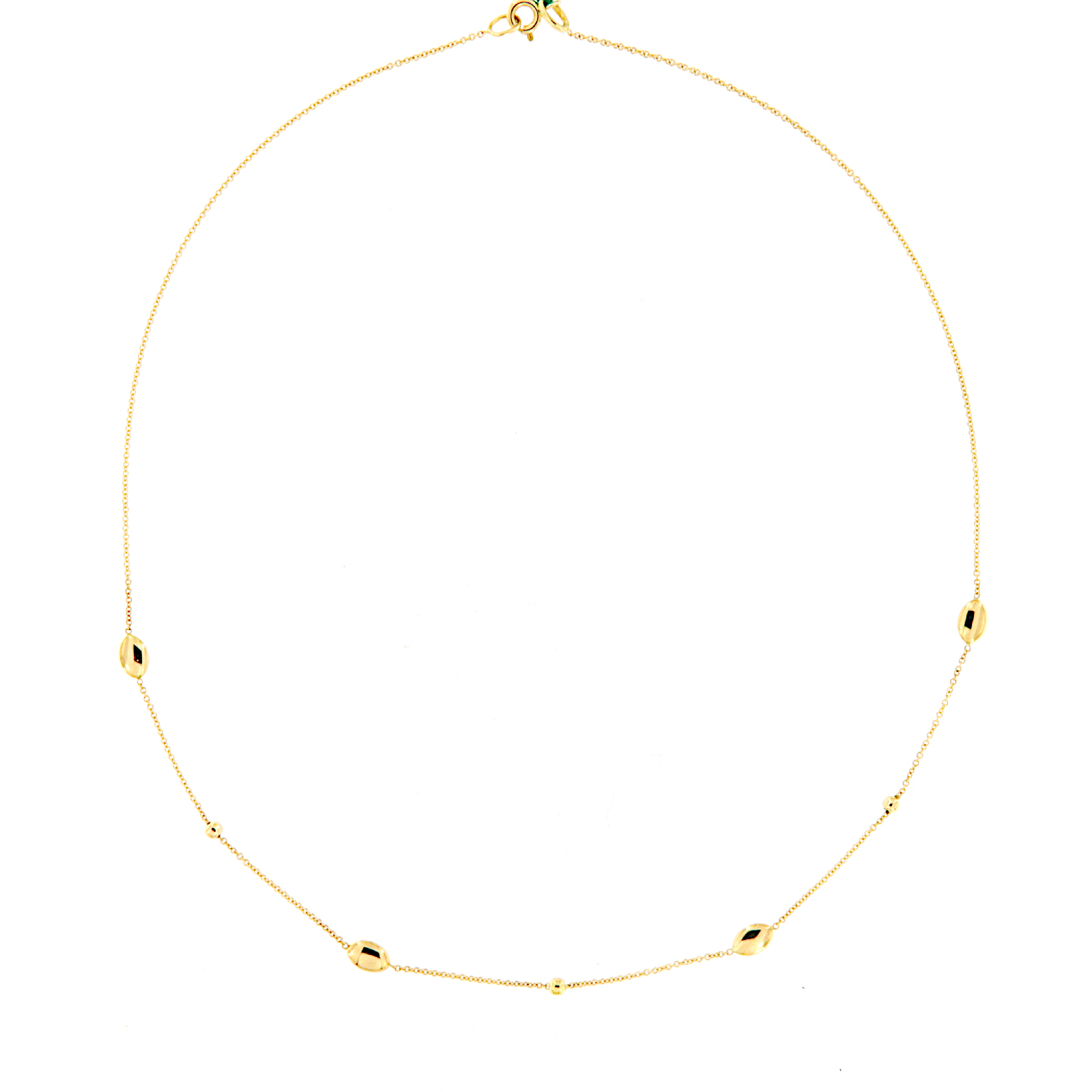 Collana a girocollo a maglia rollo sottile con alternati elementi a saponetta e palline in oro giallo.
