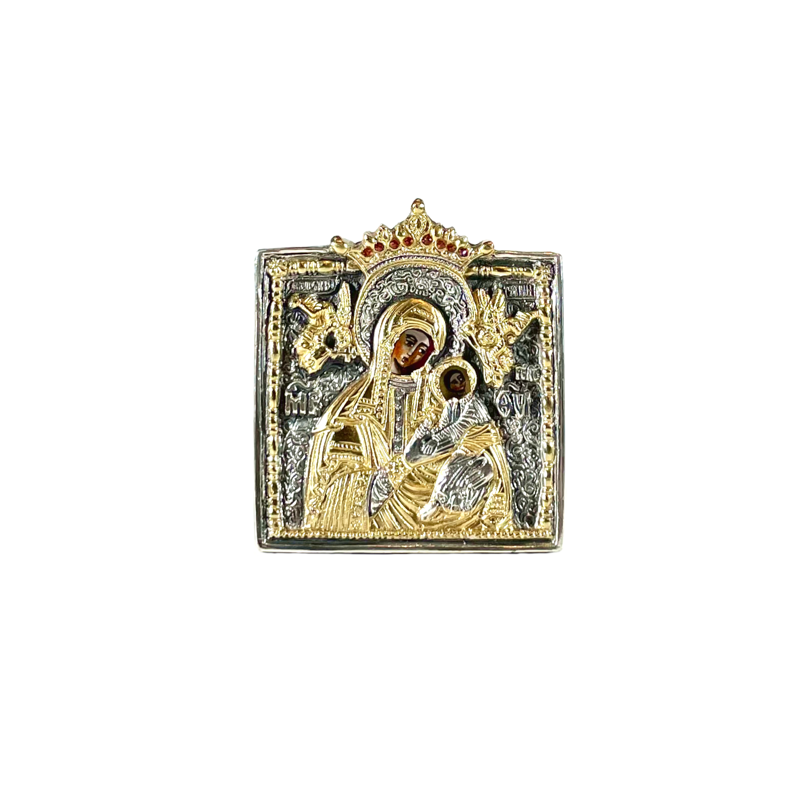 Pregevole riproduzione dell'icona "Madonna Angeli" dipinta a mano su tavola di legno e lastra in argento sbalzata e cesellata con doratura in oro zecchino.