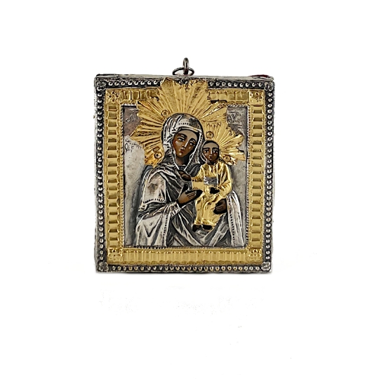 Pregevole riproduzione dell'icona "Madonnina" dipinta a mano su tavola di legno e lastra in argento sbalzata e cesellata con doratura in oro zecchino.