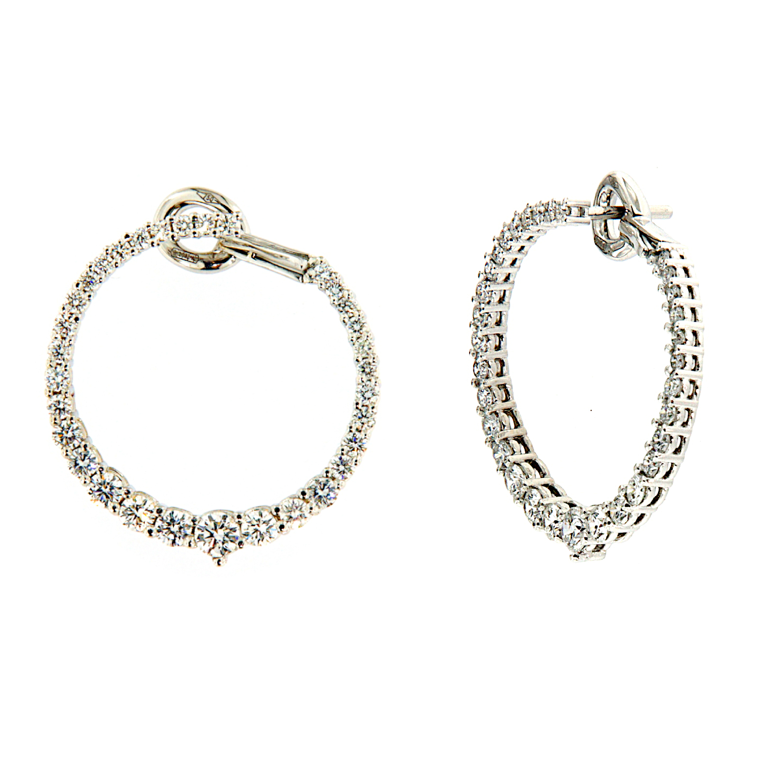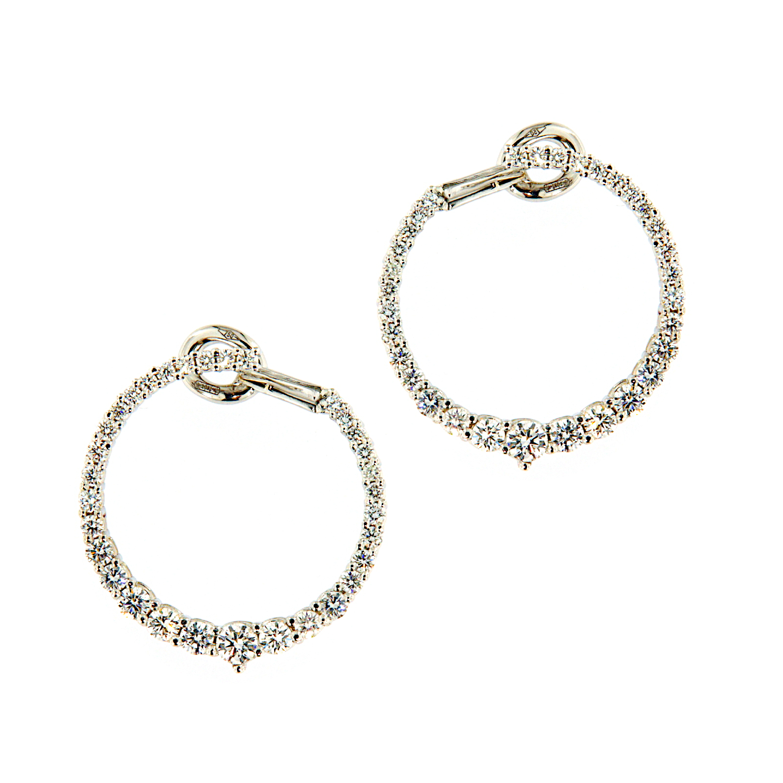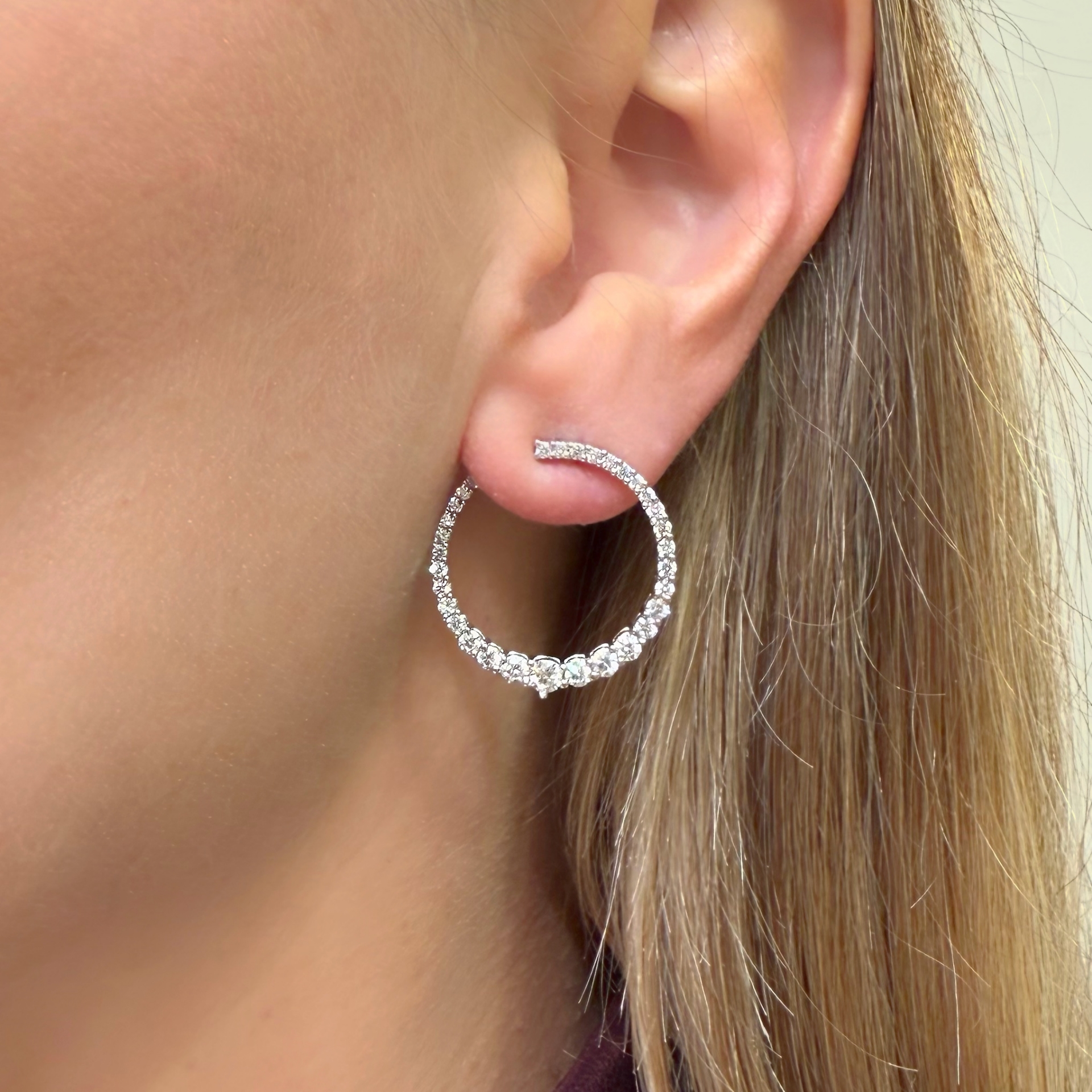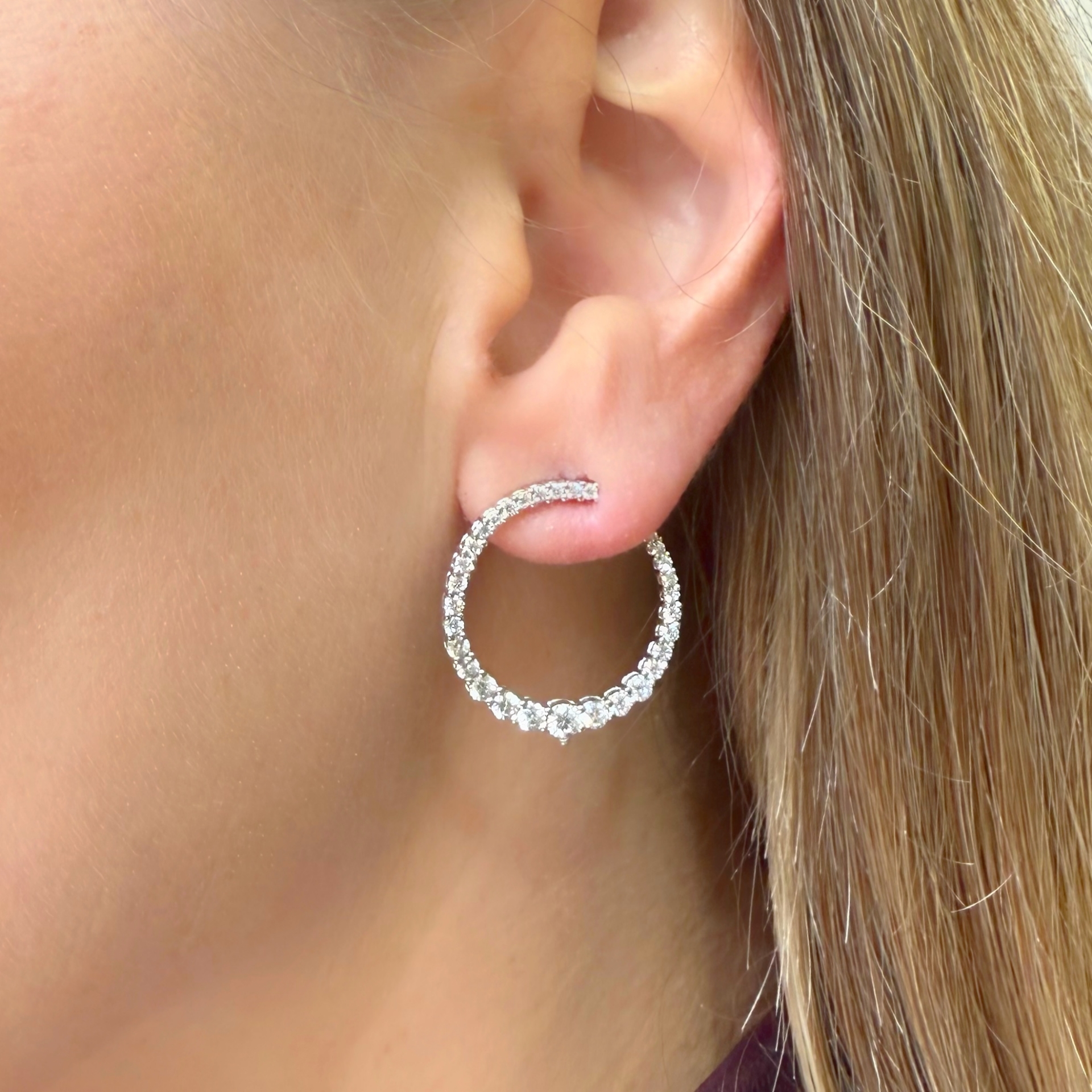 Orecchini a cerchio dal morbido movimento che avvolge il lobo con incassati su punte a filo diamanti taglio brillante con misure a degradare.