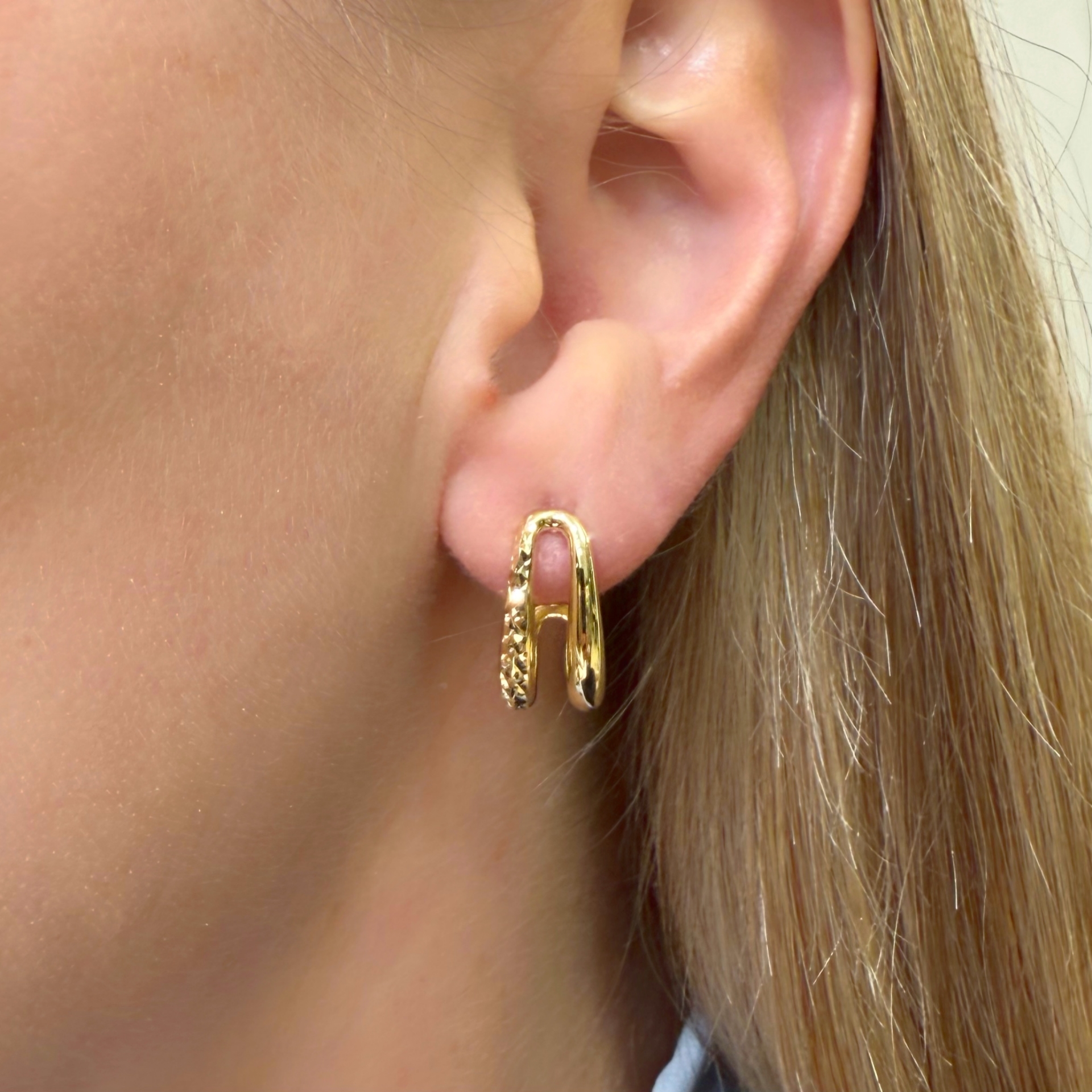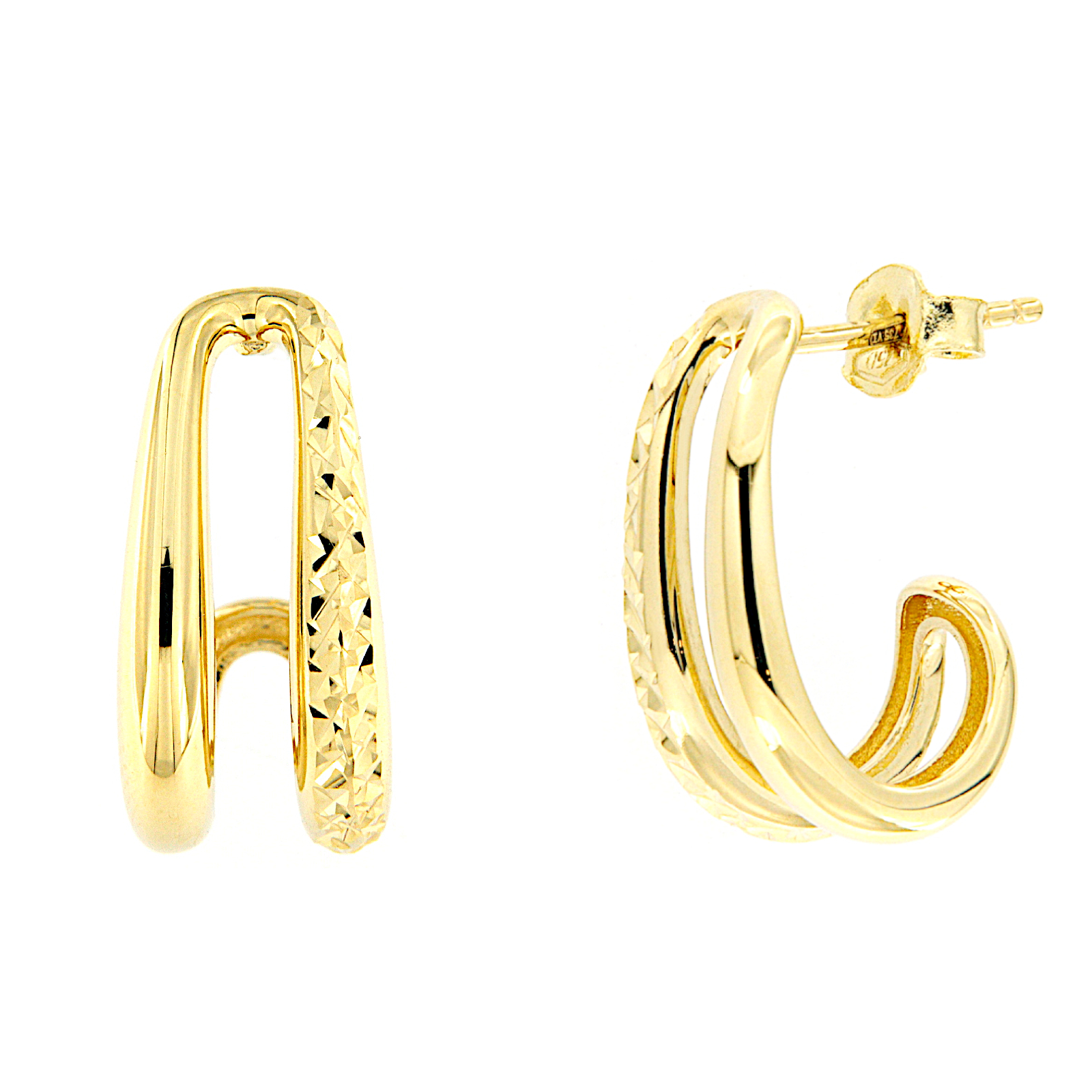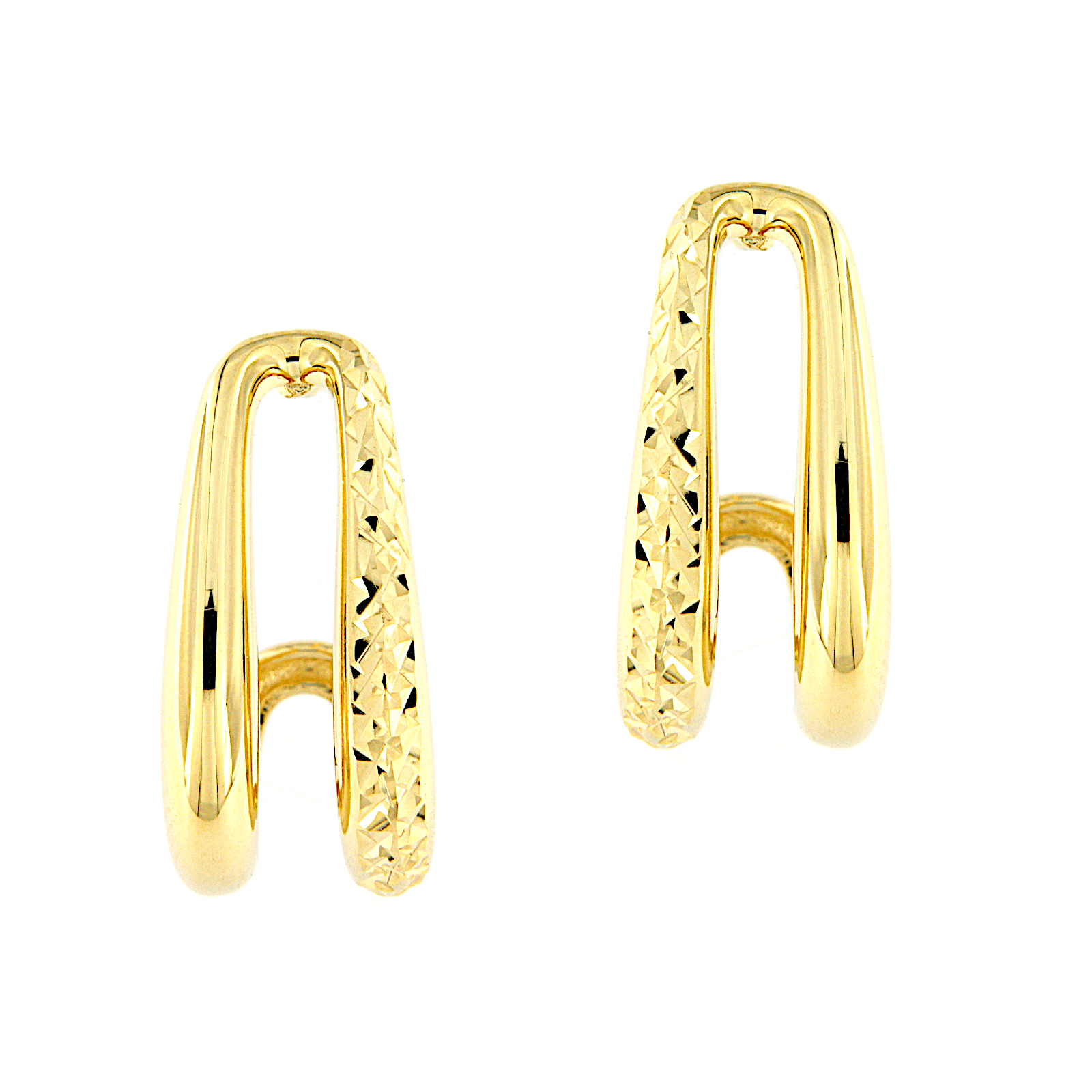 Orecchini in oro giallo a doppio elemento, lucido e con lavorazione sfaccettata.