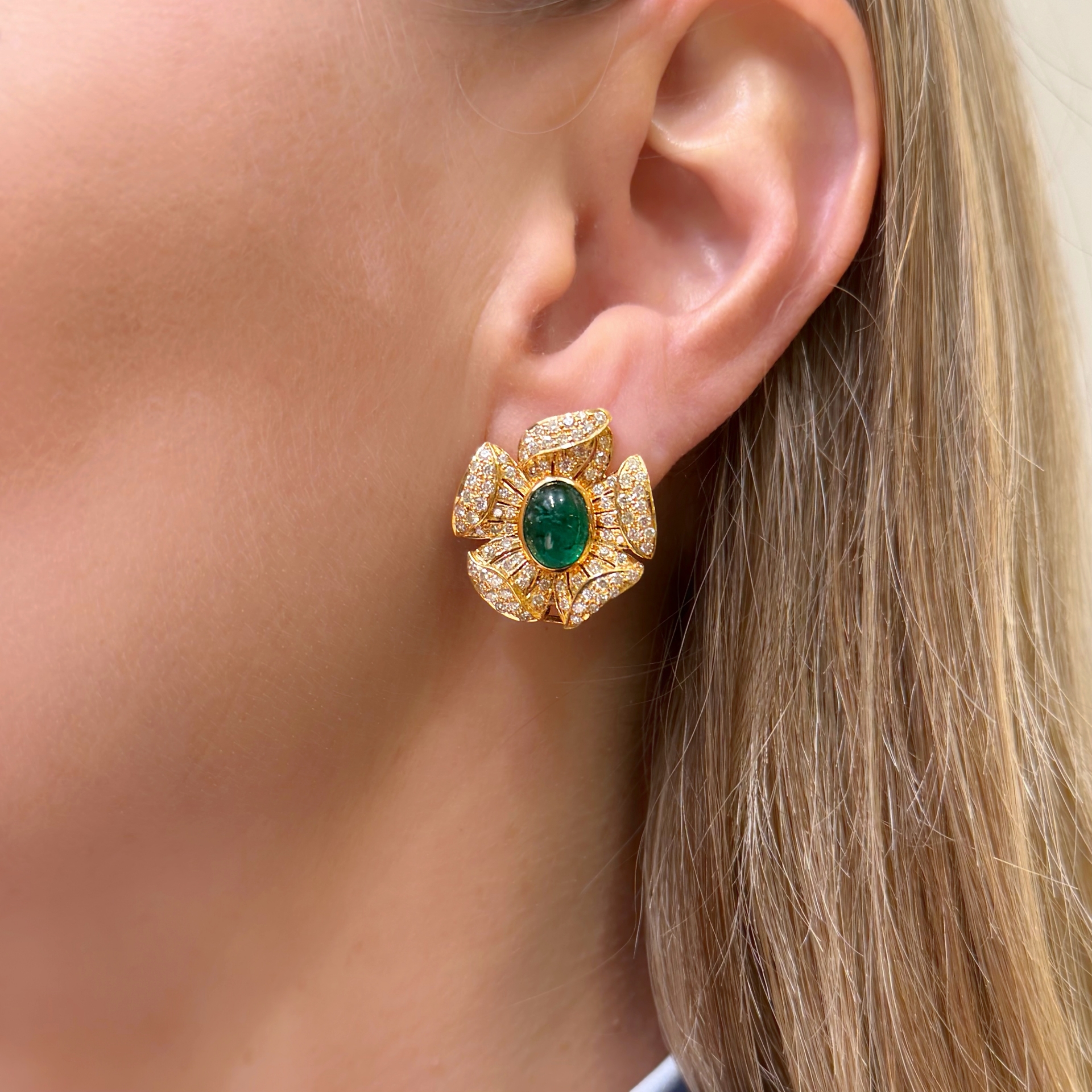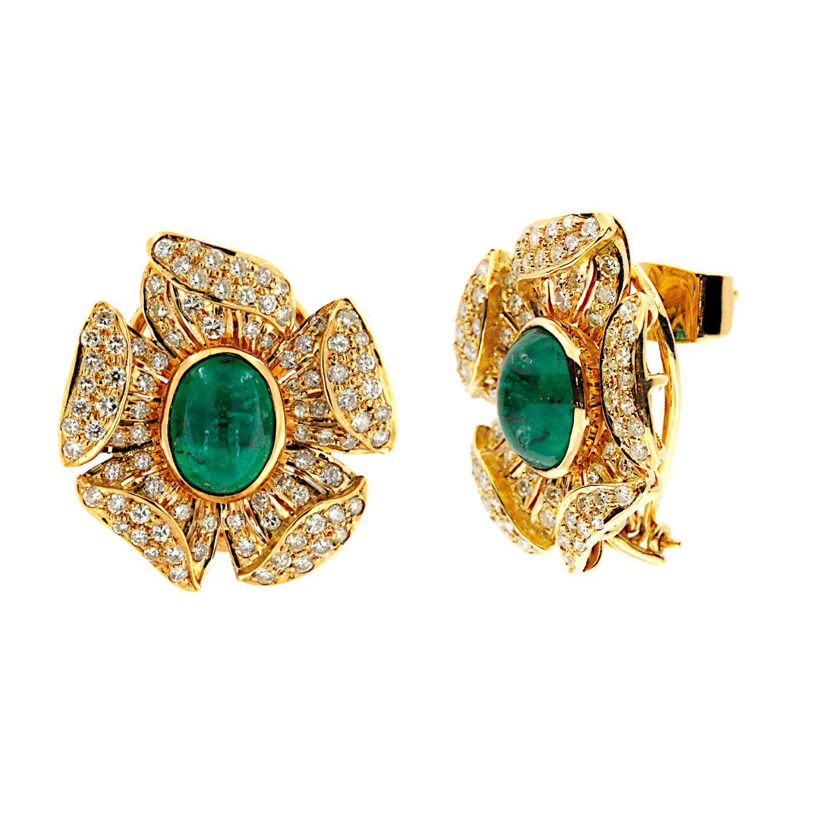 Orecchini a fiore in oro giallo con cabochon ovali di smeraldo e diamanti taglio brillante. Chiusura a ponte retto e clips e farfalla aggiuntiva.