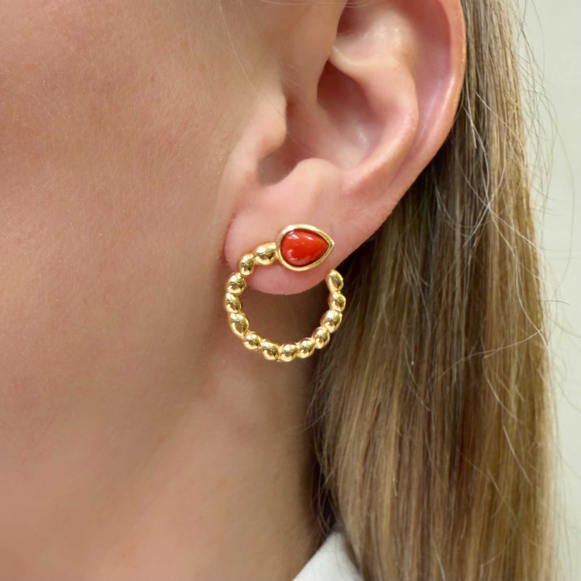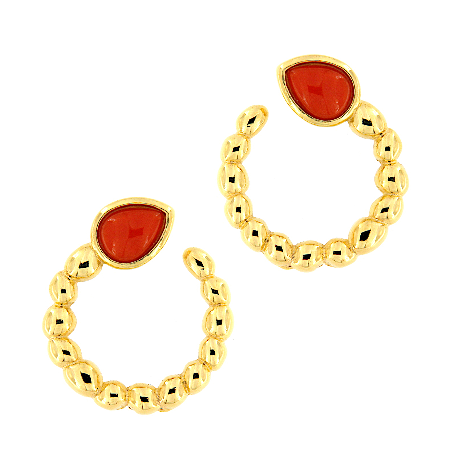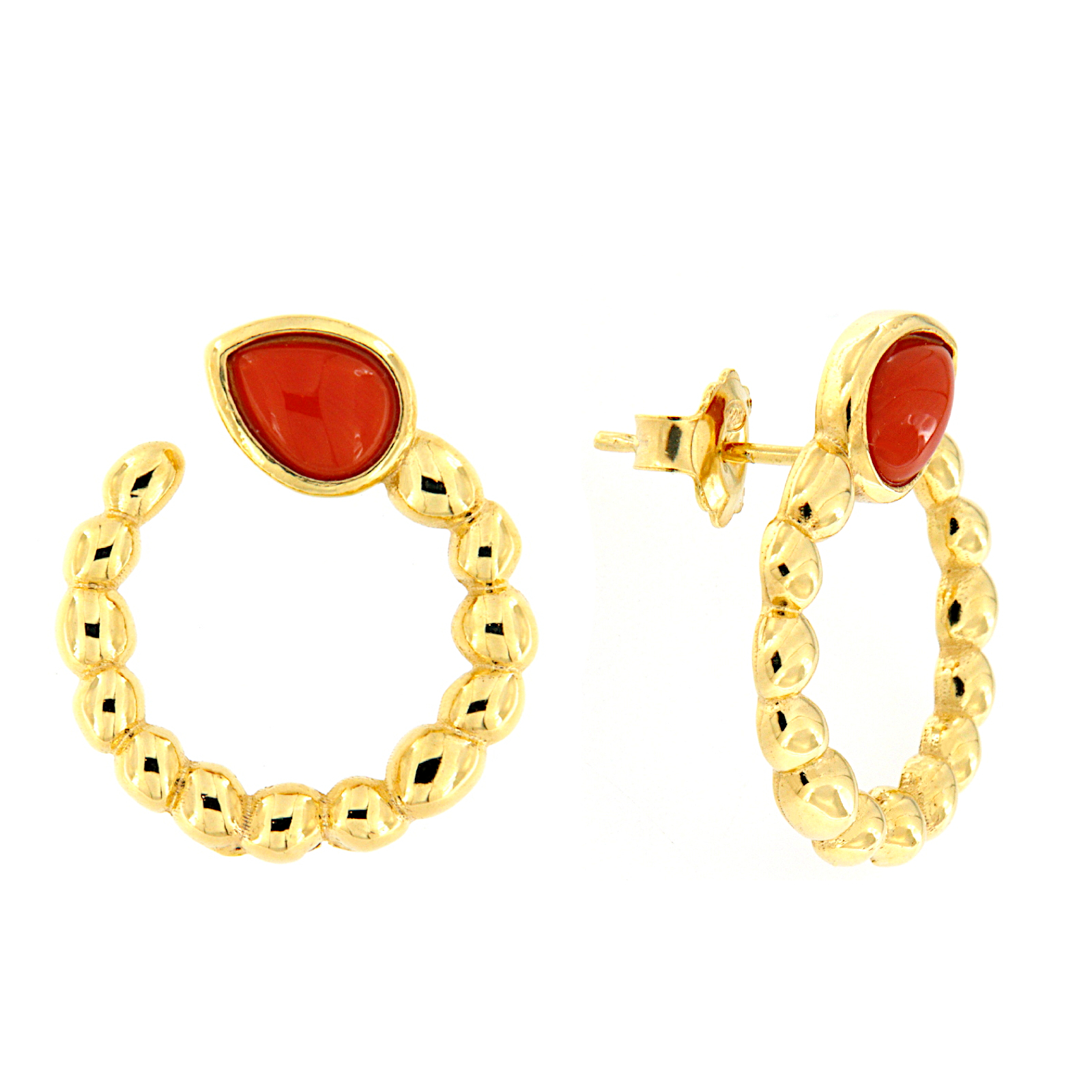 Orecchini in argento dorato a serpente con goccia di corallo rosso.