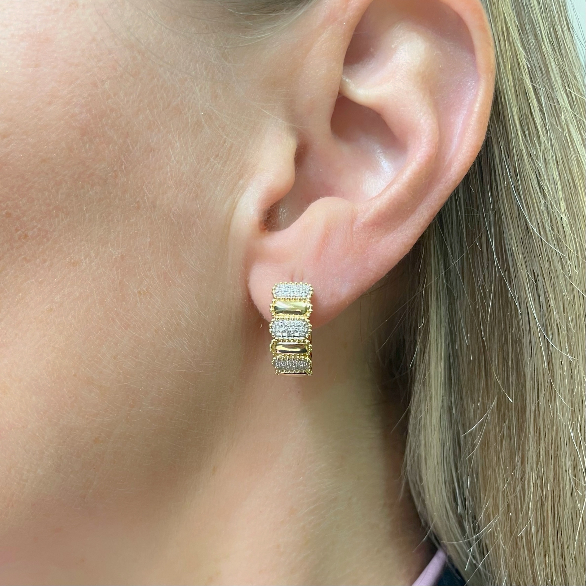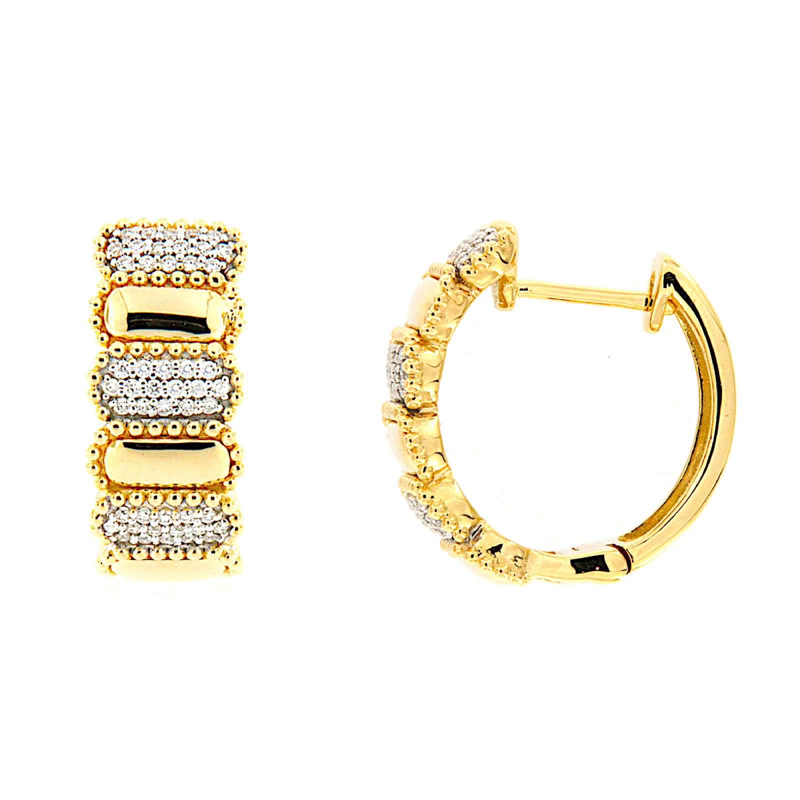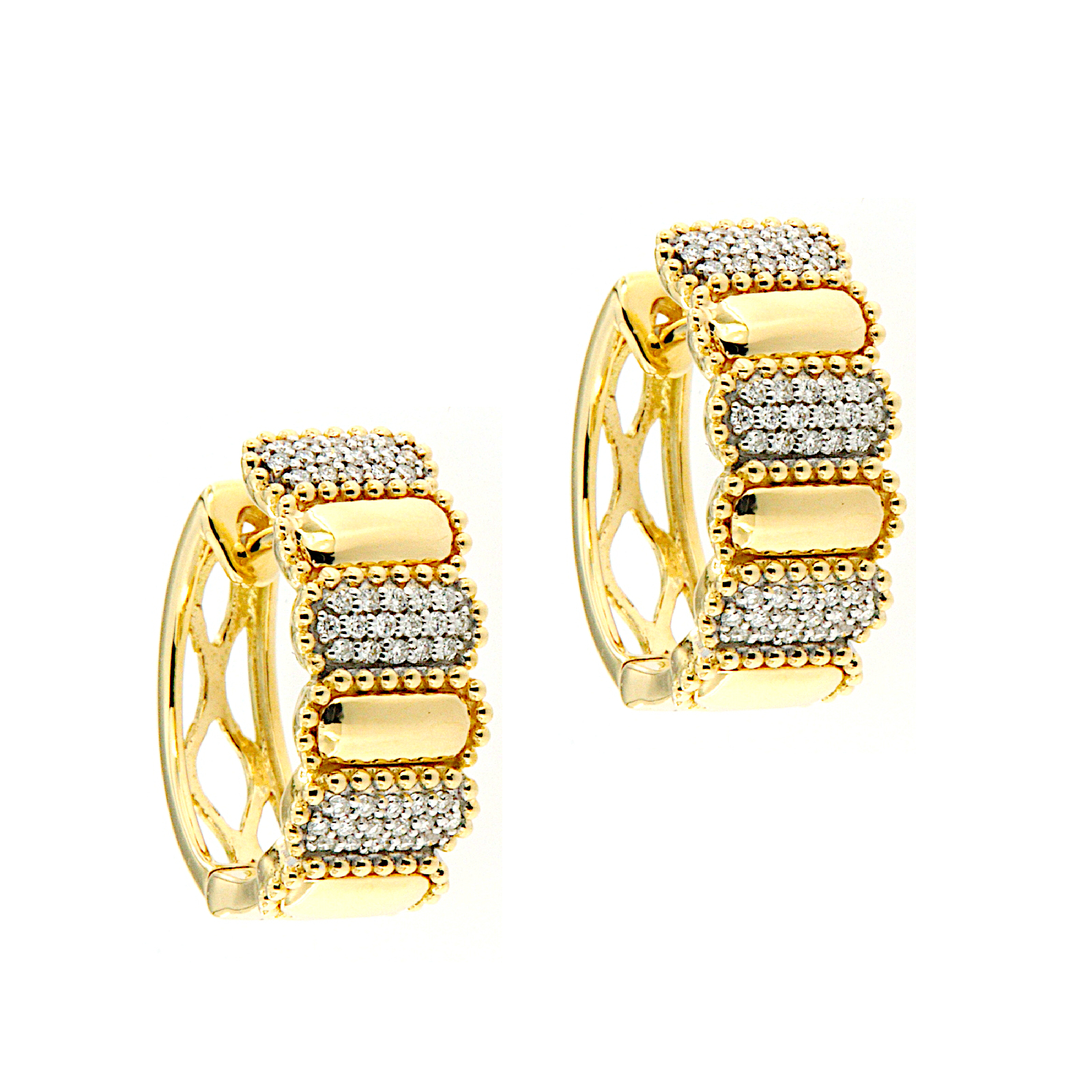 Orecchini a cerchio in oro giallo con losanghe alternate, lucide e con pavè di diamanti taglio brillante, dal contorno con lavorazione perlè.