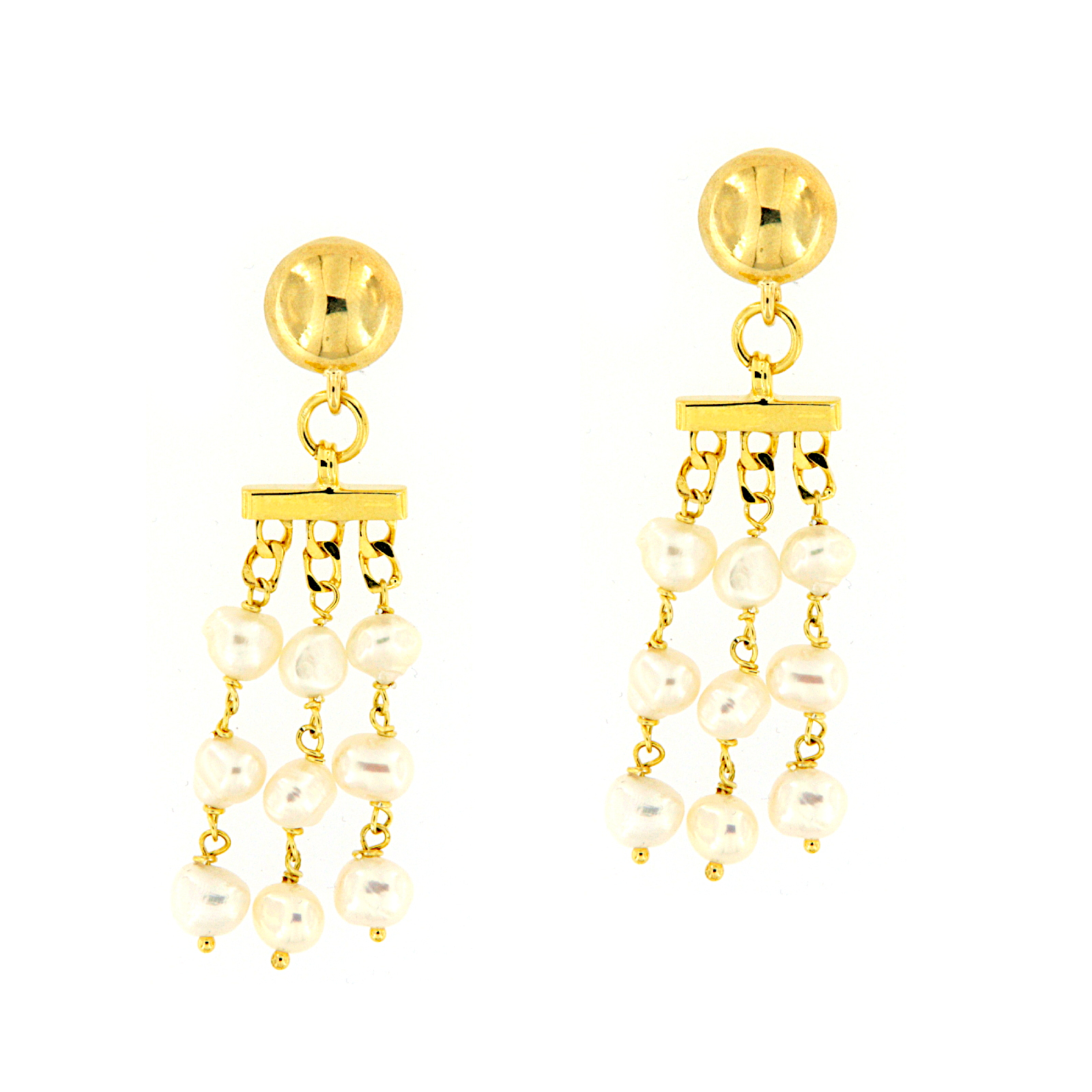 Orecchini chandelier pendenti in argento dorato a tre fili con alternate perle coltivate barocche di acqua dolce. chiusura con ponte retto e farfalla.