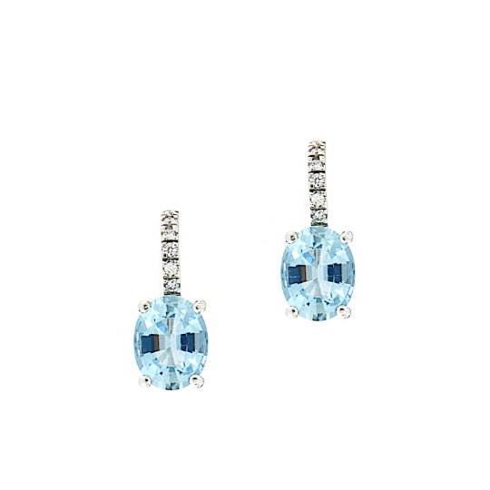 Orecchini in oro bianco con diamanti taglio brillante incassati su ponte curvo ed acquamarine. Chiusura ponte curvo e molla.