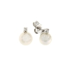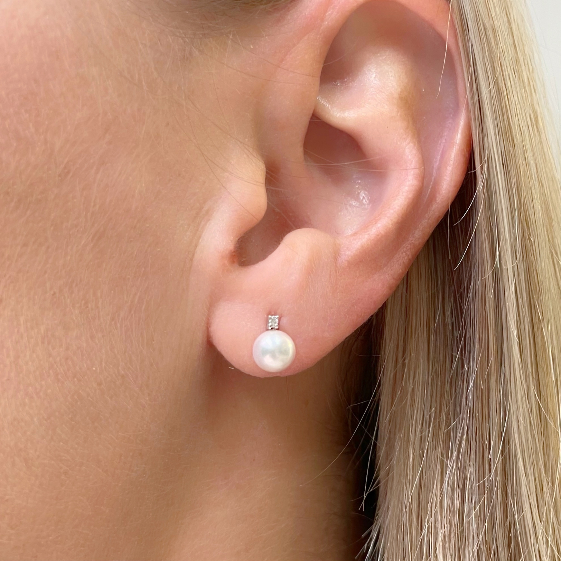 Orecchini in oro bianco modello classico con diamanti taglio brillante e perle coltivate giapponesi. Chiusura perno e vite a pressione.