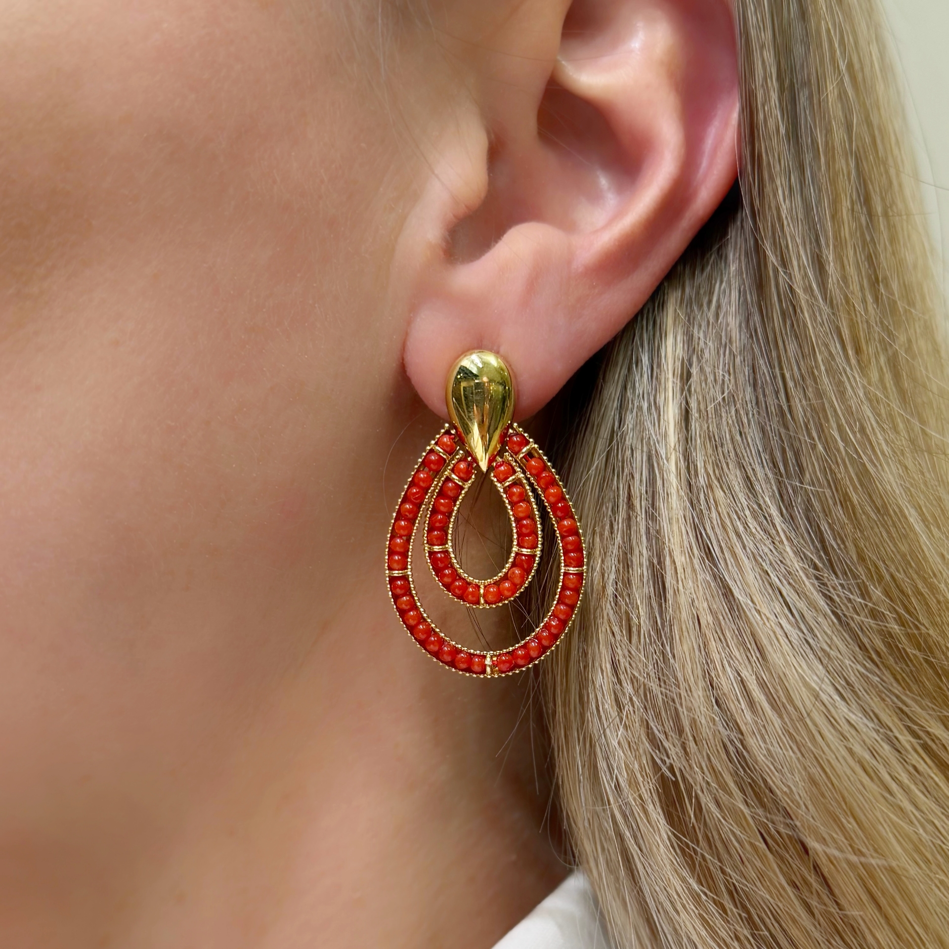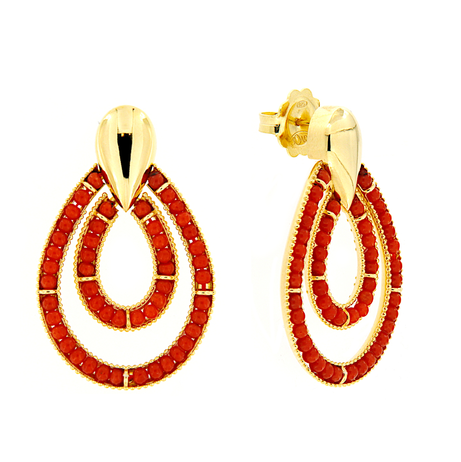 Orecchini pendenti in argento dorato a goccia con doppia fila lavorazione perlè e pallini di corallo.