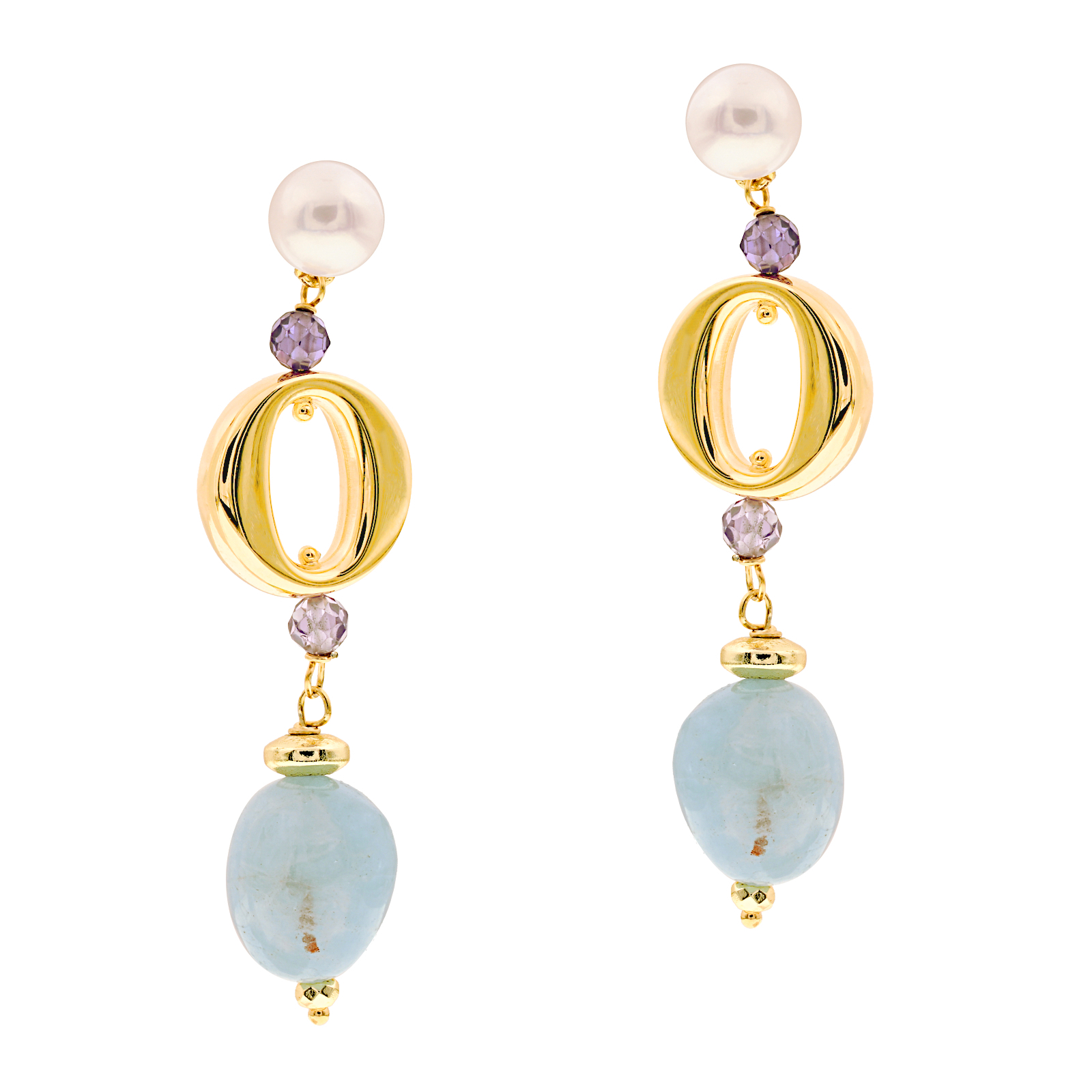 Orecchini pendenti con maglia ovale scatolata in argento dorato, sasso di ametisa, perle coltivate d'acqua dolce e zirconi viola. Chiusura con ponte retto e farfalla.
