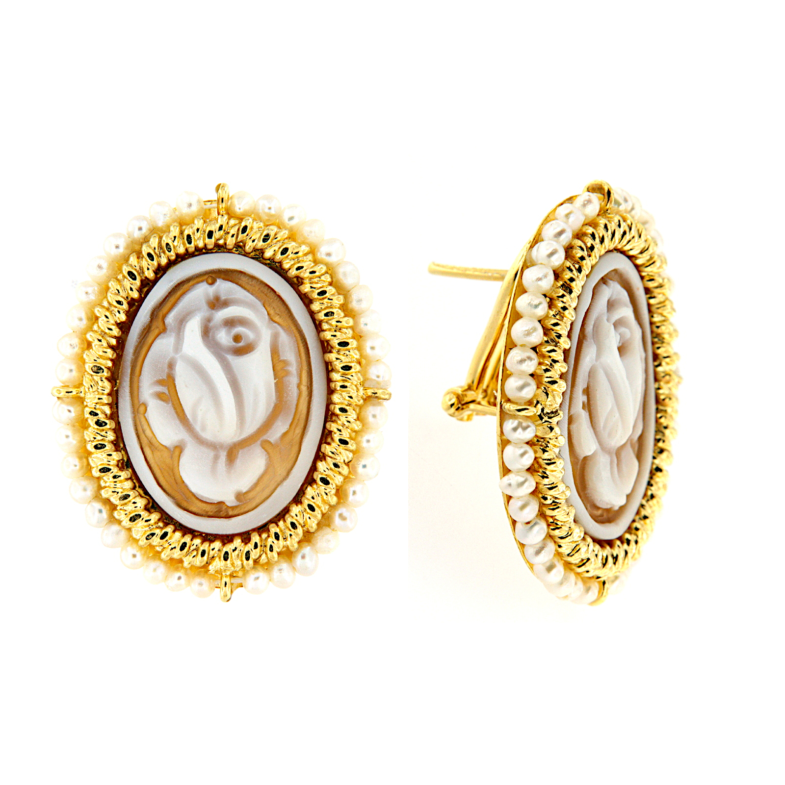 Orecchini in argento dorato con lavorazione a corda, cammeo centrale e giro esterno di perline. Chiusura ponte retto e clips